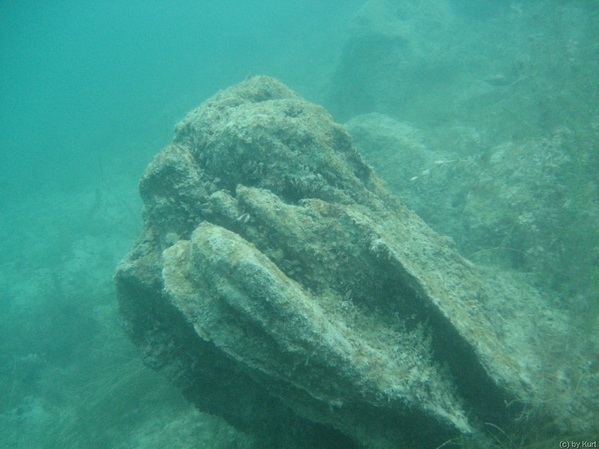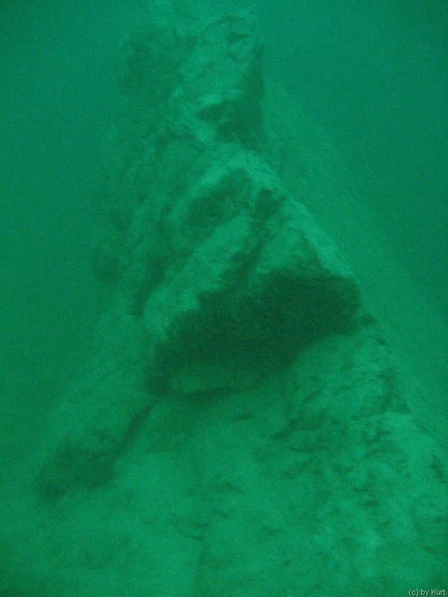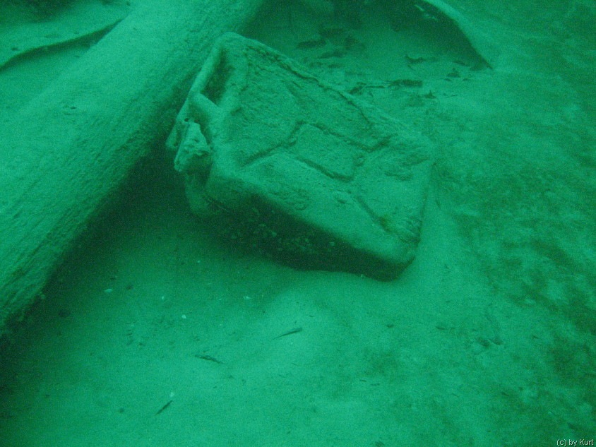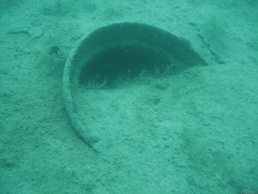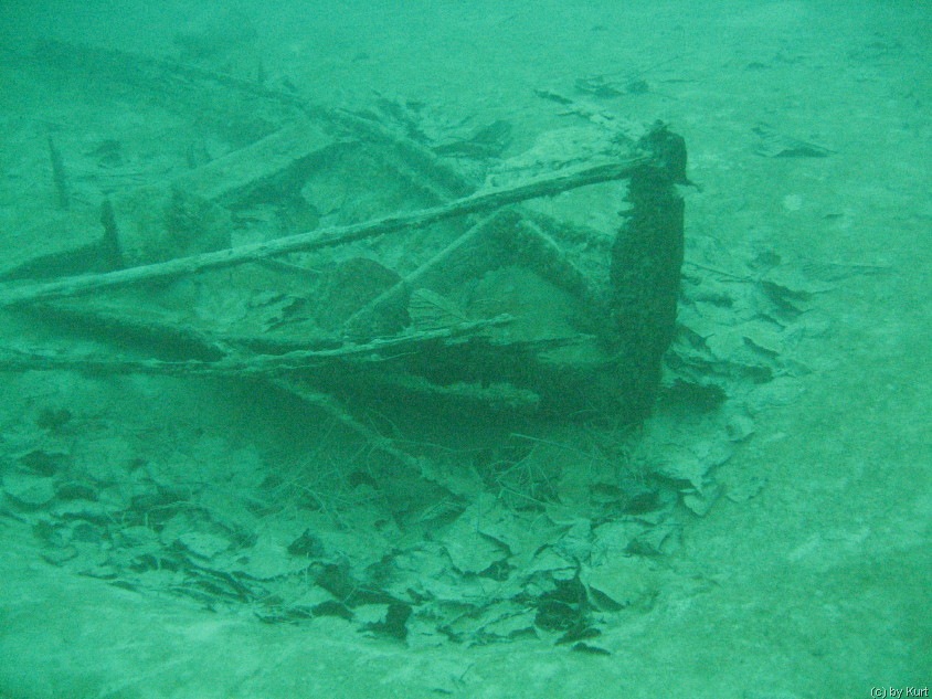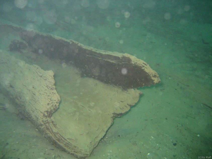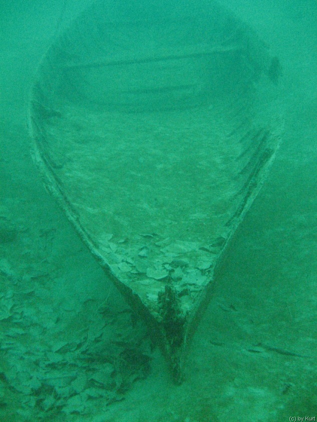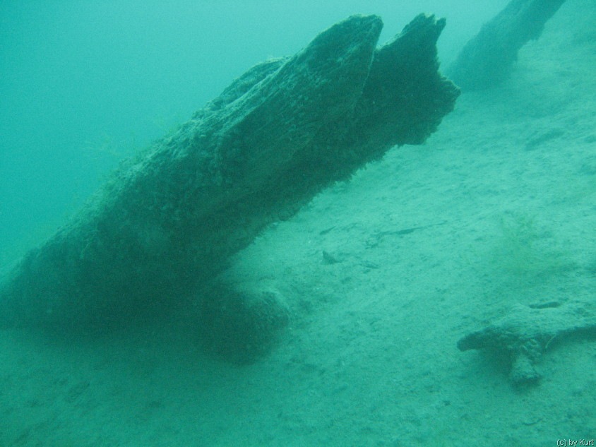 Ich verfolgte das selbe Ziel wie Michael (Bericht Hinkelsteine) und tauche in 25m Tiefe 20 Minuten Richtung Süden. Ziemlich viel Unrat liegt hier am Boden verstreut. Doch dann entdecke ich in 18m Tiefe ein zerfallenes Holzboot, 20m weiter ein noch besser erhaltenes größeres Boot.