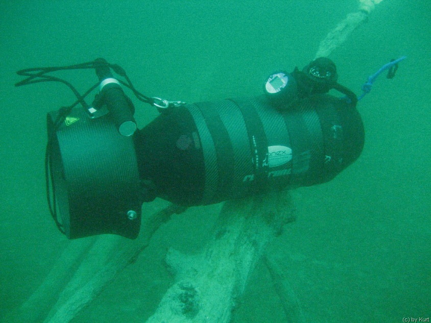 Ich bin Dienstag an der Basis U-96 gegen 11 Uhr angekommen. Am nächsten Tag soll es mit Jürgen für 4 Tage zum Walchensee gehen. Da die Sonne scheint, ich noch genügend Zeit habe, beschliesse ich noch einen Tauchgang mit meinem Scooter an den Hinkelsteinen zu machen. Mit Doppel 8 (Eigenumbau) und einer 5l Stage O2 steige ich im mittleren Einstieg ein u. fahre auf 25m zum mittleren Hinkelstein.