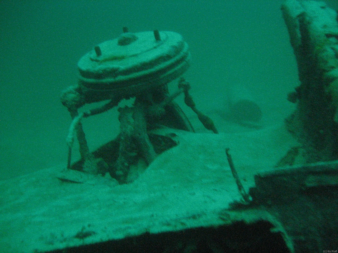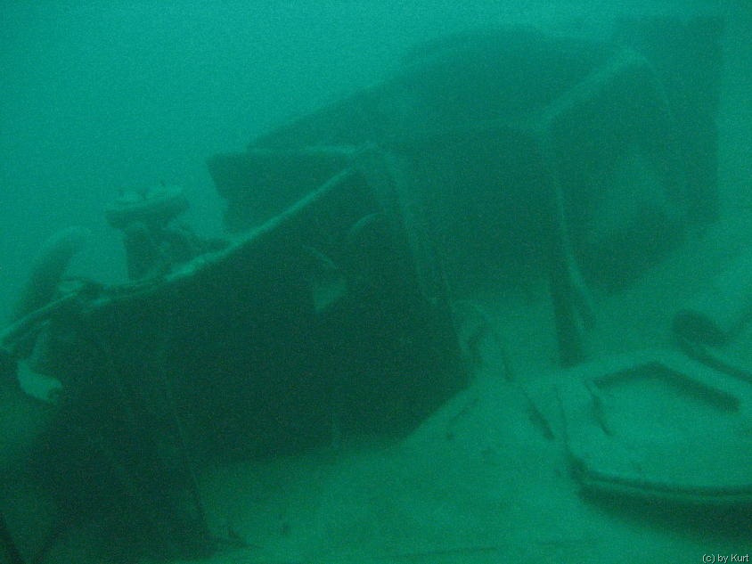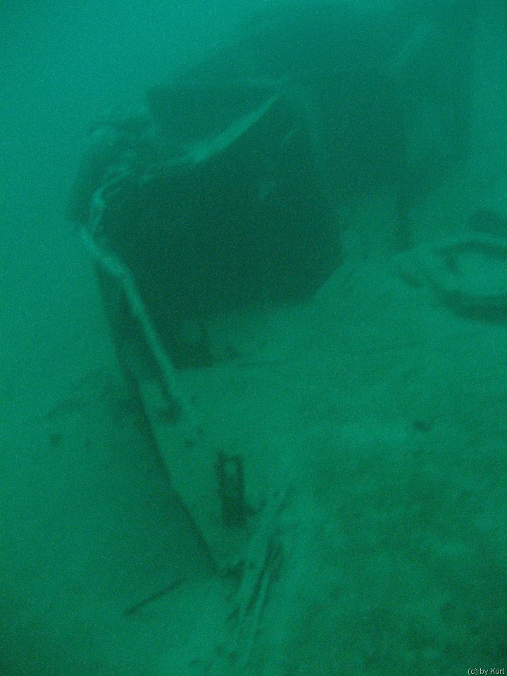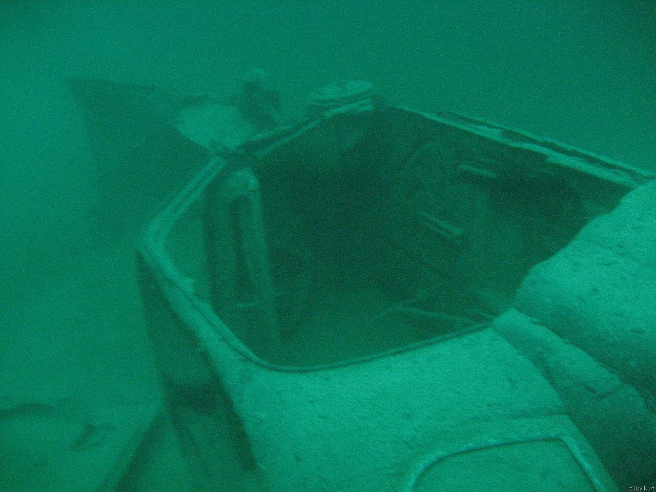 Wie auf den folgenden Fotos zu sehen ist, habe ich das Autowrack, das auf der linken Seite liegt in 29m Tiefe gefunden. Der Zustand ist sehr schlecht, außer den Achsen, Lenkrad, ist das Wrack ziemlich ausgeschlachtet. An der Karosserie hat der Zahn der Zeit genagt.