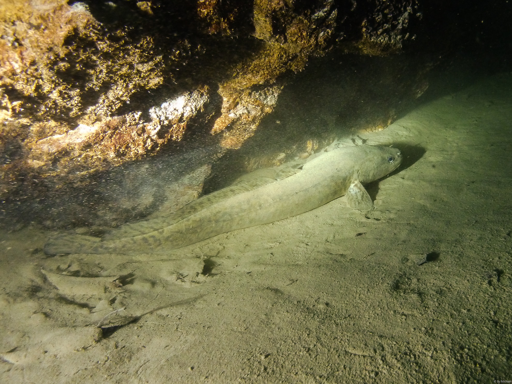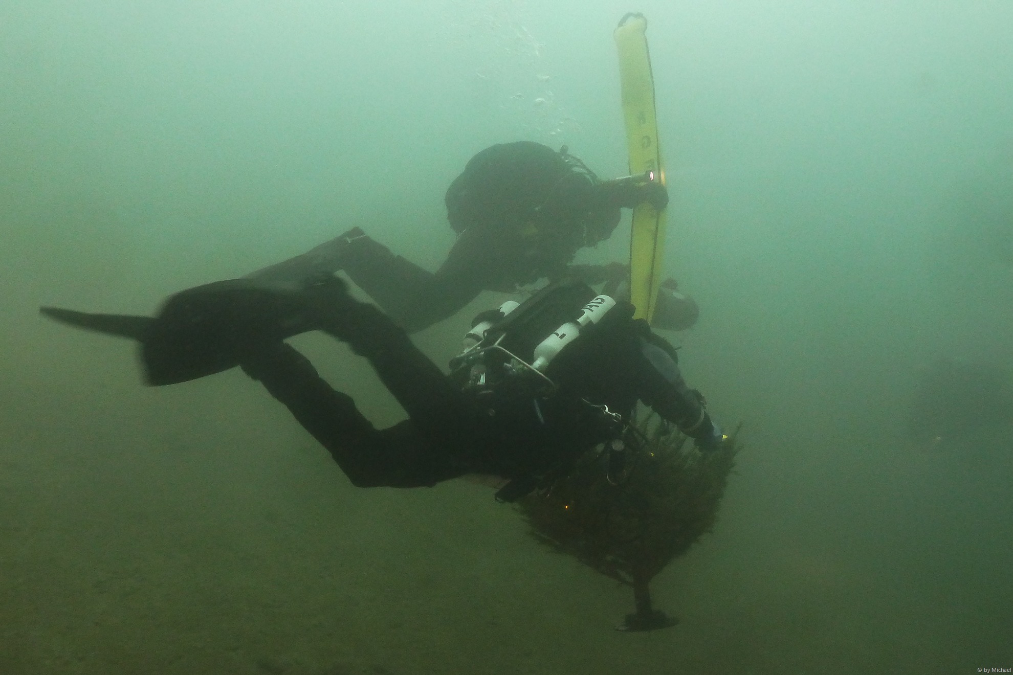 Nach mehreren Minuten erkenne ich regelmäßig Schlammwolken am Grund und kann diesen bis zu Kurt folgen.