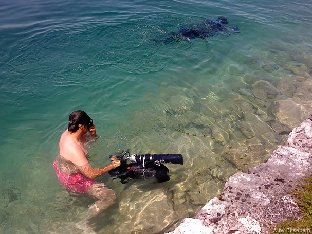 Aber der bisherige Tag war für Frank schon ein kleines Abenteuer. Bei seinem SF2 hat sich das ADV gelockert und er war 3 Stunden lang auf der Suche nach einem passenden Werkzeug, um es wieder zu befestigen – schließlich wurde er bei Hermann Kadasch fündig! Dann vor dem Tauchgang zeigten seine Sensoren etwas eigenartige Werte an, so dass er den Kopf checkt und die Sensoren neu Kalibriert. Als wir endlich im Wasser sind springt sein Bonex Referenz nicht an! Also nochmal raus aus dem Wasser, Handschuhe ausziehen, Scooterkopf entfernen – das Stromkabel anschließen – und wieder alles schließen und anziehen!