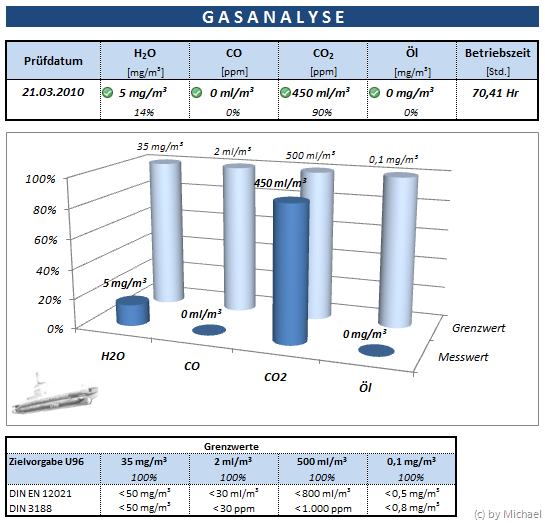 Sämtliche Werte sind im grünen Bereich. Für uns liegt es ja auch im eigenen Interesse, dass wir eine gute und saubere Pressluft haben. Immerhin tauchen wir selber mit dieser Luft, und mischen auch unsere Trimix bzw. Dekogase damit.