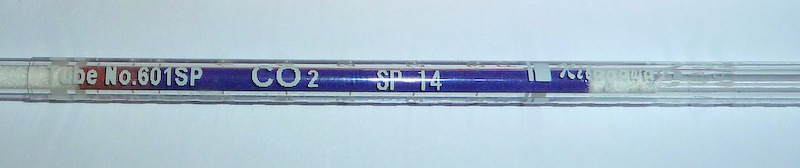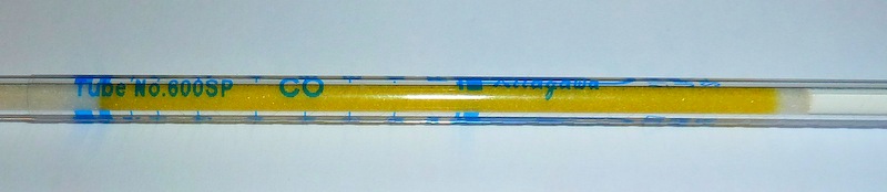 Bei der Messung vom CO kann kein Ausschlag erkannt werden. Seht selber hin. Um die Funktionsfähigkeit zu überprüfen lasse ich gelegentlich einen Raucher durch das Röhrchen pusten. Heute ist jedoch keiner anwesend.