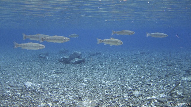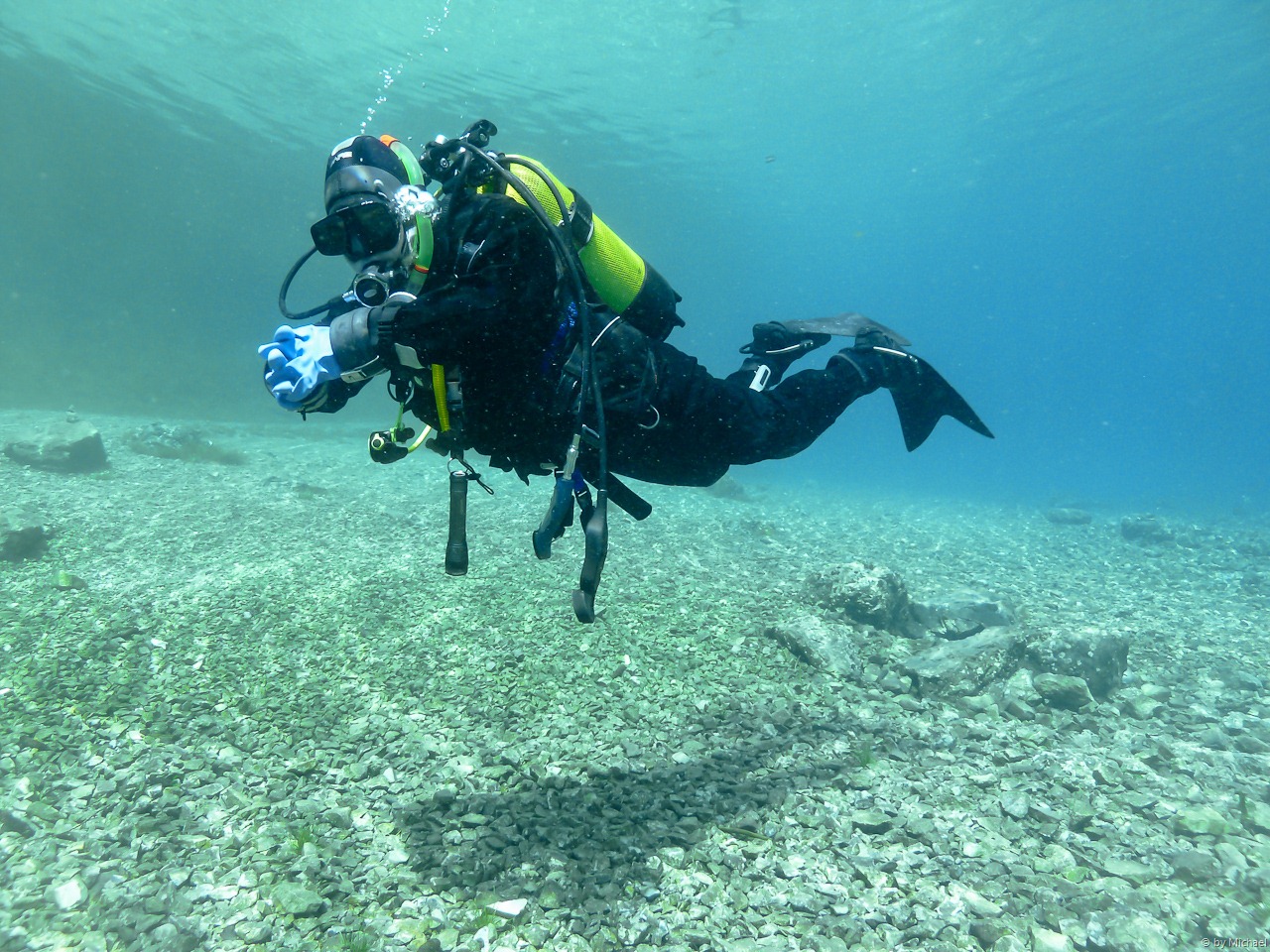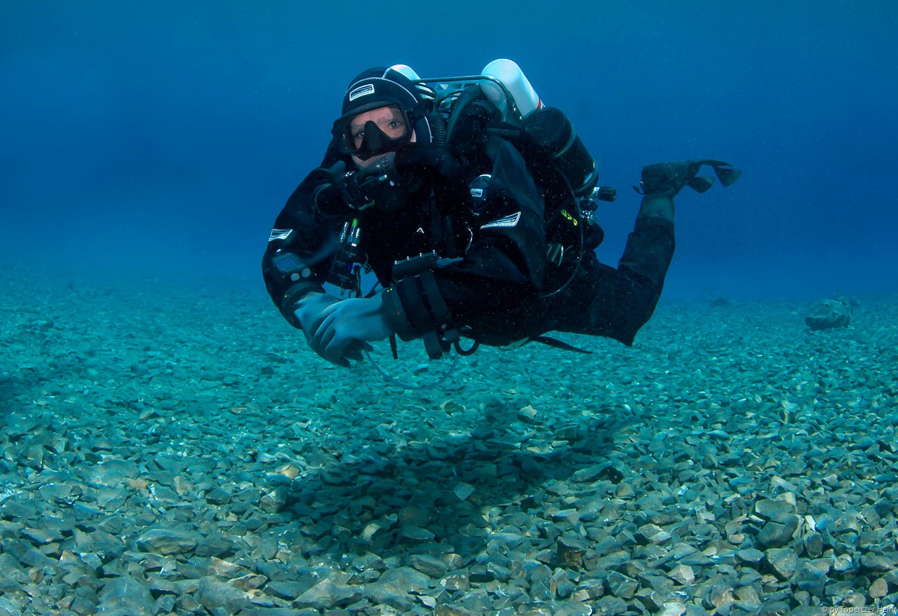 Am See angekommen bezahlen wir unsere Tauchgebühr im Gasthof und beginnen, nach einer kurzen Plauderei mit den einheimischen Damen, unser Tauchgerödel herzurichten. Ein kurzes abklärendes Briefing, damit sich keiner im See verliert – was bei dem leider niedrigen Wasserstand kein Problem darstellt – und schon geht es ab in den See. Gleich zu Beginn begrüßt uns ein Fischschwarm, der im weiteren Tauchverlauf einen sicheren Abstand zu uns bewahrt.