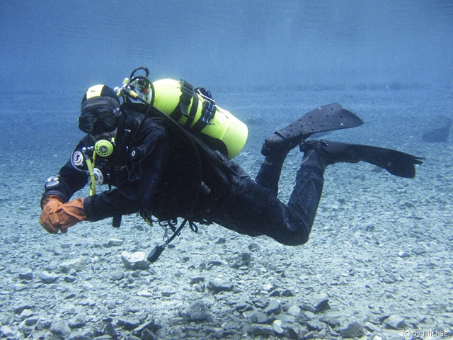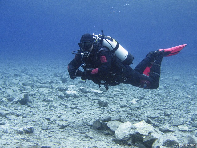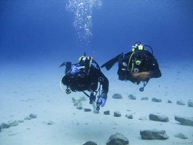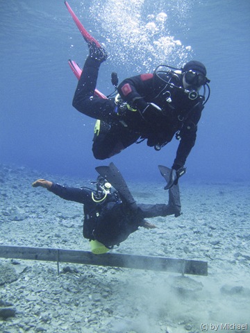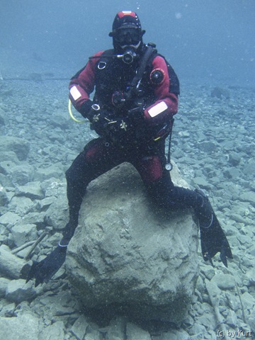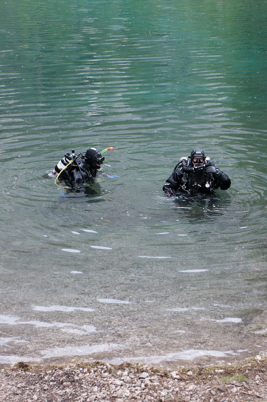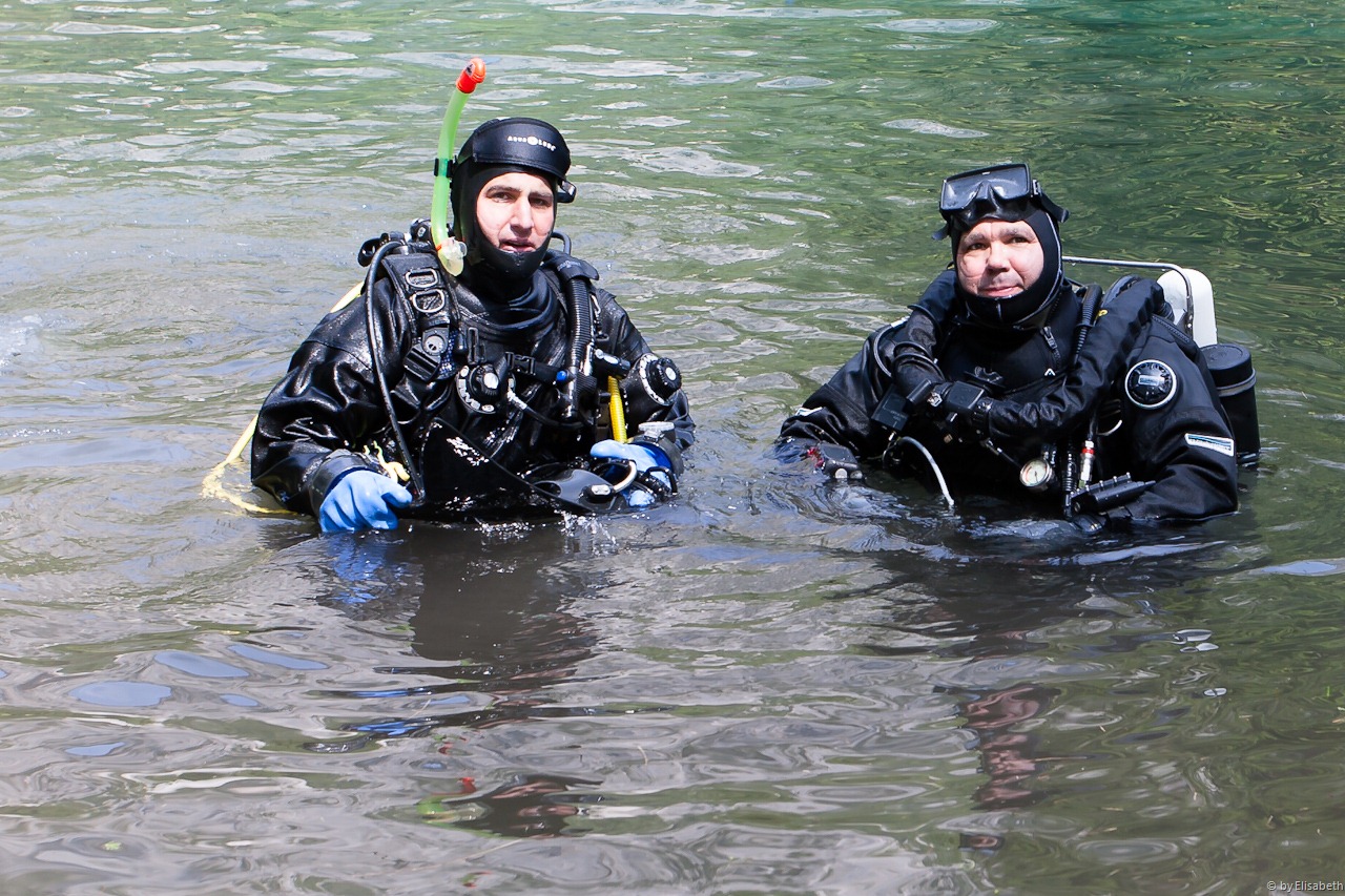Dann begegneten uns noch 2 ganz spezielle Taucher! Mit D12 und Stage bewaffnet durchquerten Sie den 5m tiefen See. Sie wollten die Tauchgebühr wohl gründlich ausnützen und den See mehrmals umrunden. 🙂