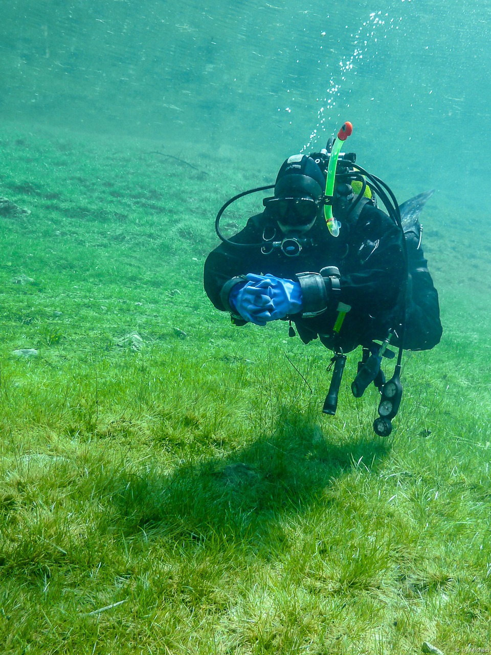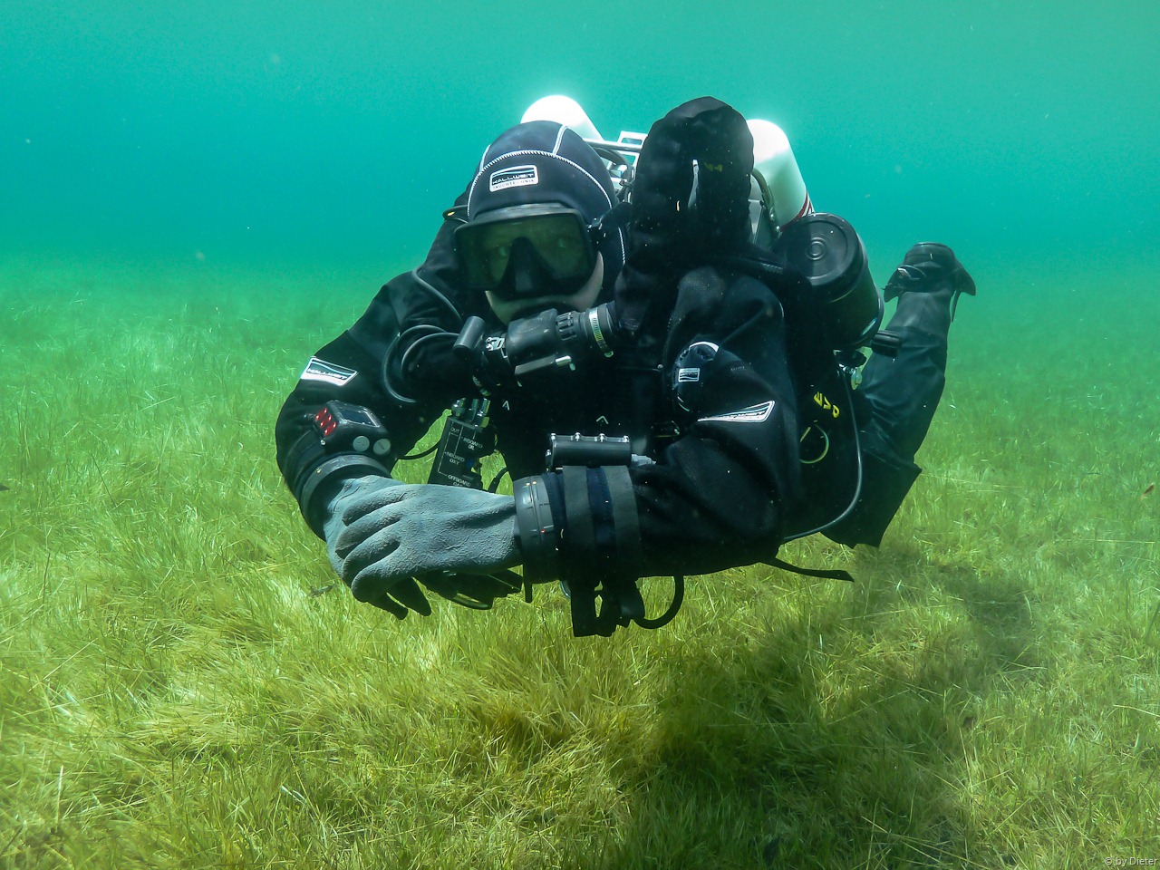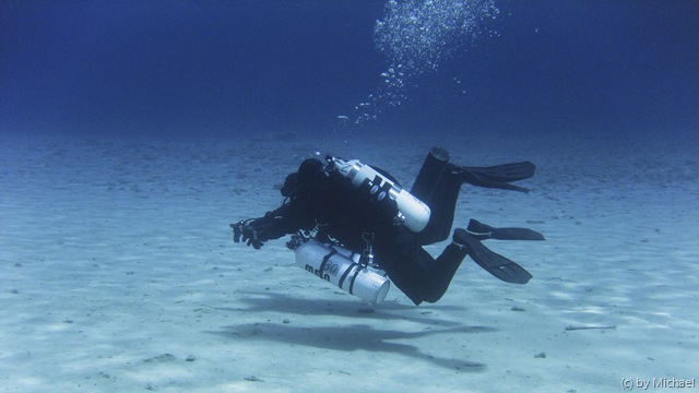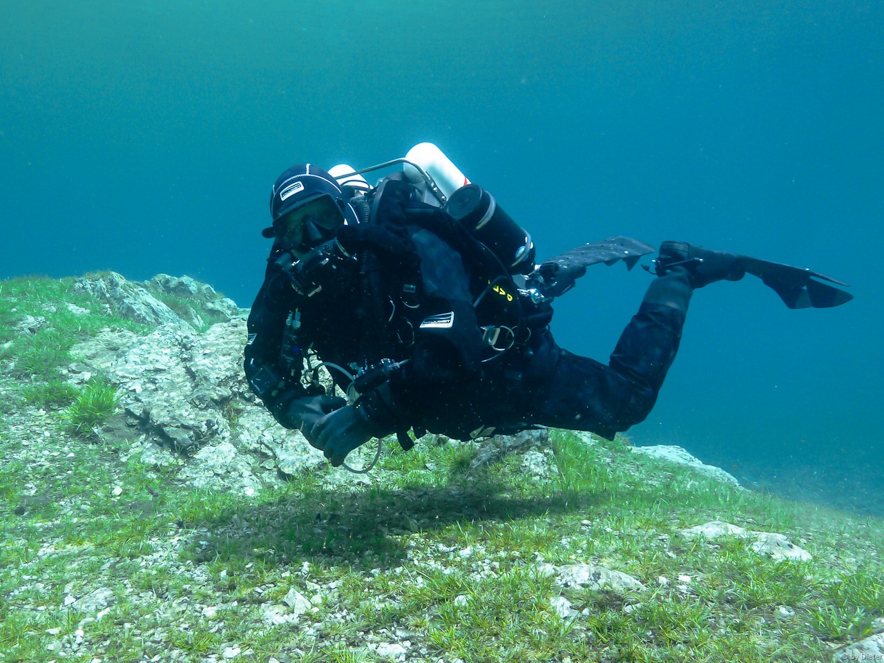 Dann begegneten uns noch 2 ganz spezielle Taucher! Mit D12 und Stage bewaffnet durchquerten Sie den 5m tiefen See. Sie wollten die Tauchgebühr wohl gründlich ausnützen und den See mehrmals umrunden. 🙂