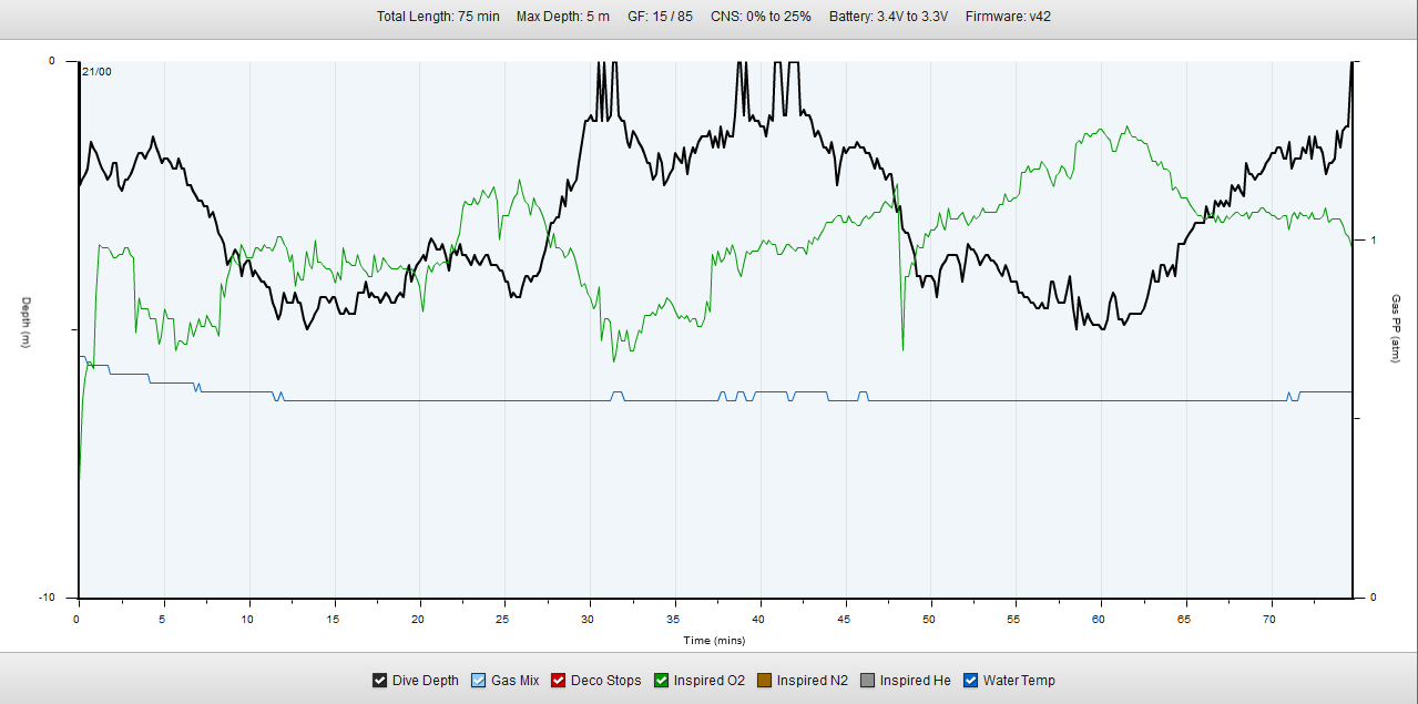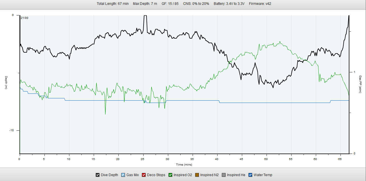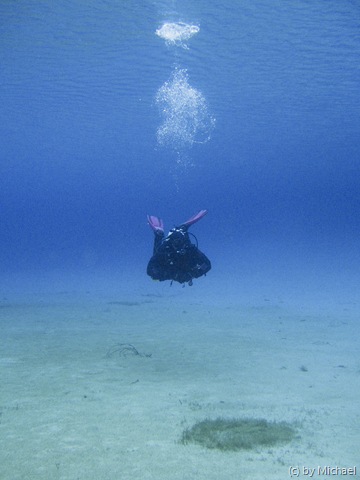 Beim 2. Tauchgang schaffen wir 67 Minuten Tauchzeit, bevor Dieter gerne wieder an Land geht, um schnell seinen Anzug zu öffnen.![]()