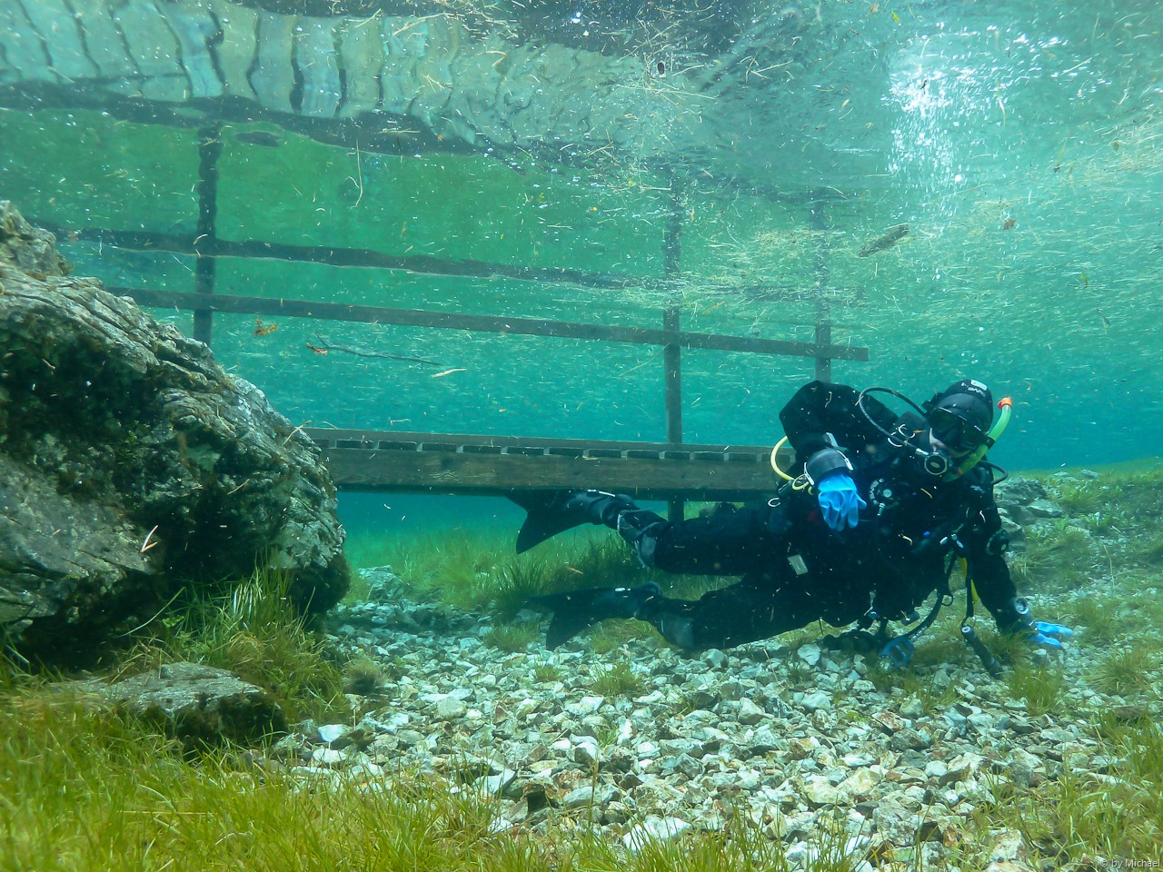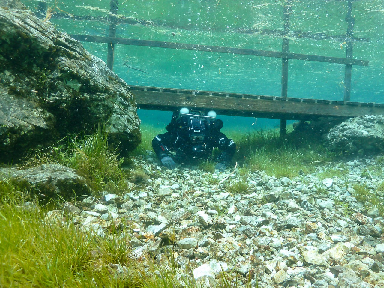 des Sees, und planen im 2. Tauchgang links zum Steg zu tauchen. Der See hat überaschend angenehme 7°C und eine Tiefe von knapp über 5m. Die ausgeschriebenen 7m haben wir beim ersten Tauchgang nicht entdeckt. Ich habe meine Unterwasserkamera mit und wir machen beide einige Fotos.