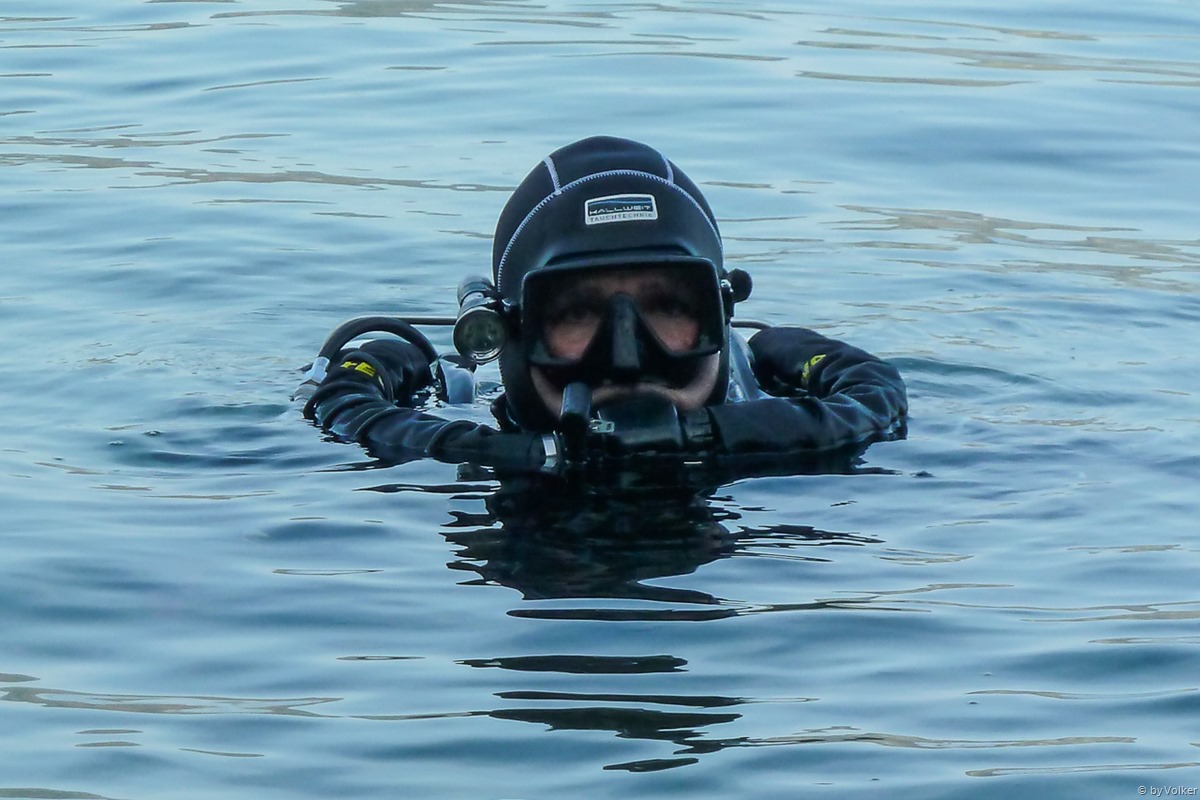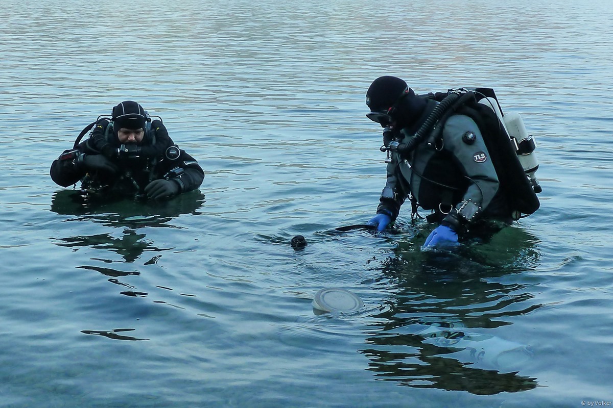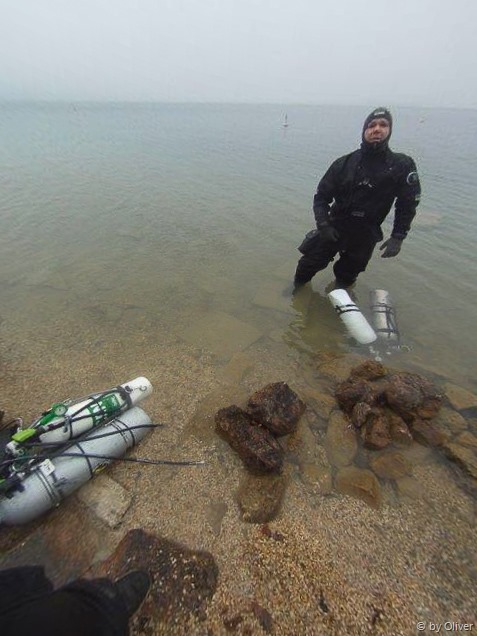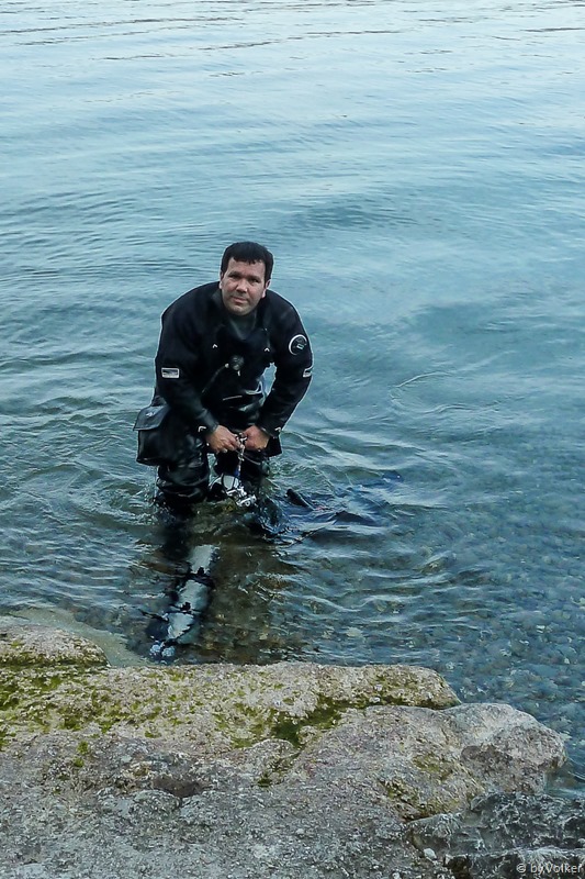 In der Basis eingetroffen finde ich Volker schlafend vor. Er wartet schon fertig vorbereitet auf der Couch. Ich richte meine Tauchausrüstung zusammen und wir fahren kurz darauf zum Tauchplatz Hinkelsteine. Um 17:32 Uhr tauchen wir gemeinsam ab. Wider erwarten haben wir doch noch Tageslicht für unseren Tauchgang.