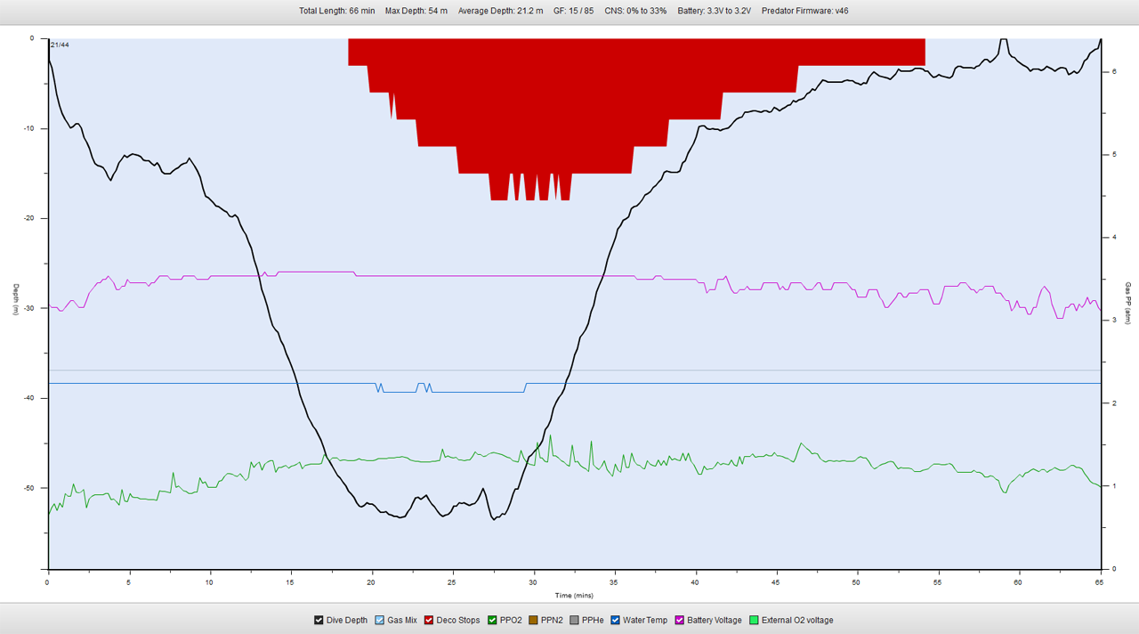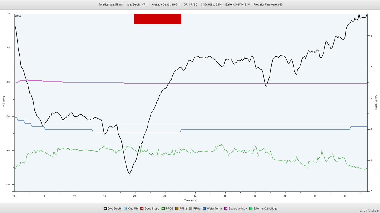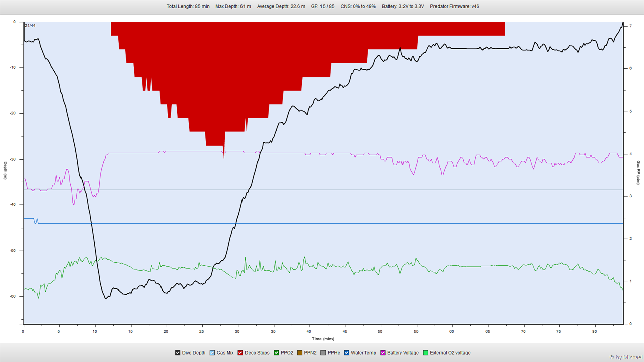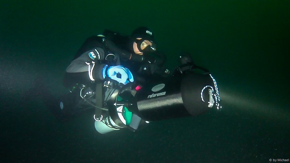 Da wir mit Luft in den Geräten unterwegs sind, setzen wir uns ein Tiefenlimit von maximal 45m, das ist auf dieser Tiefe etwa ein EAN24 als Atemgas im Loop.