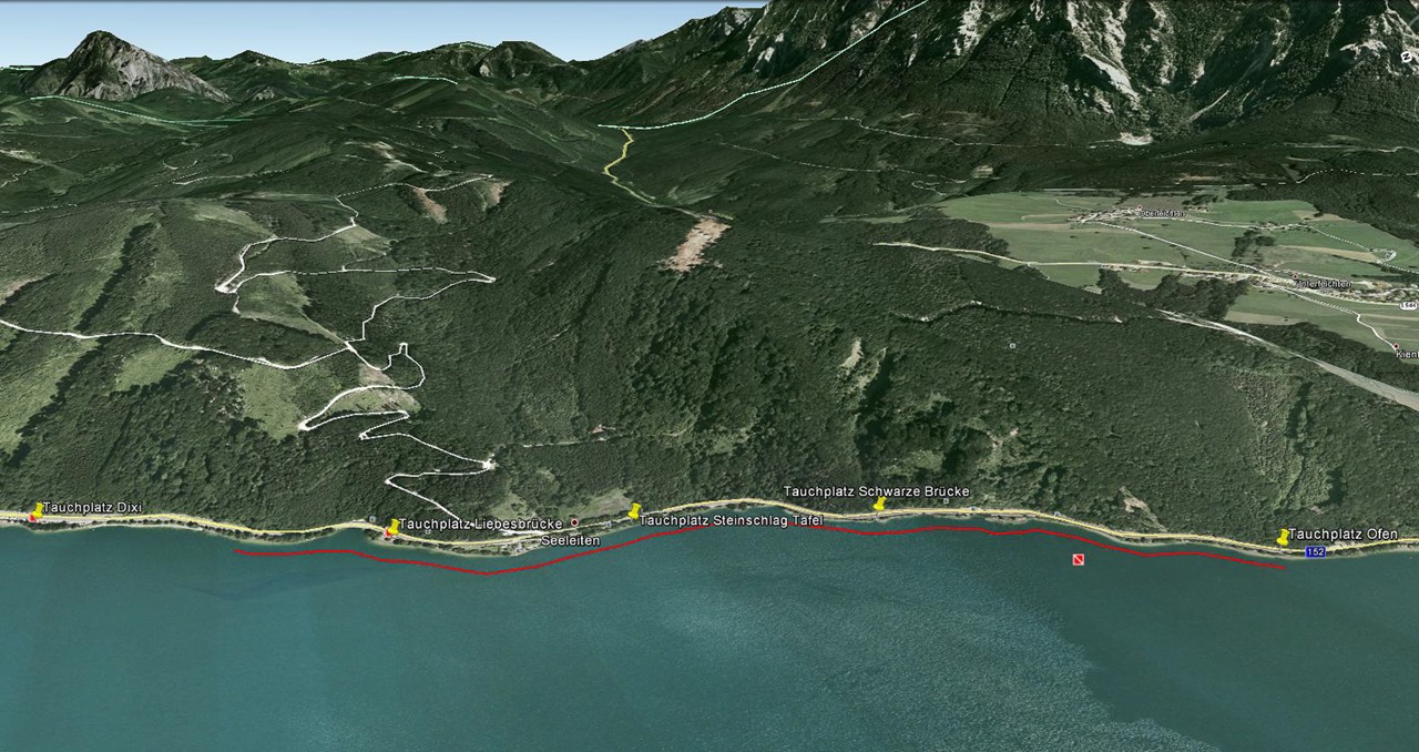 Wir tauchen etwa 15 Minuten in 35m Tiefe, bis wir die Schlierwand erreichen. Danach folgen wir ihr hinaus in den See bis in eine Tiefe von 45m. Wir folgen der Wand noch eine Zeit lang, bis wir die Oberkante der Wand nur mehr schwer erkennen können. Mit einem anderen Gasgemisch könnte man die Wand bis in ca. 60m Tiefe verfolgen, danach läuft sie im Seegrund aus.