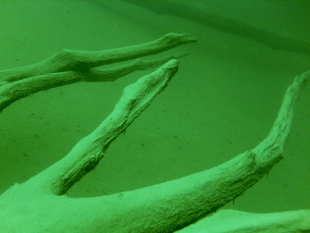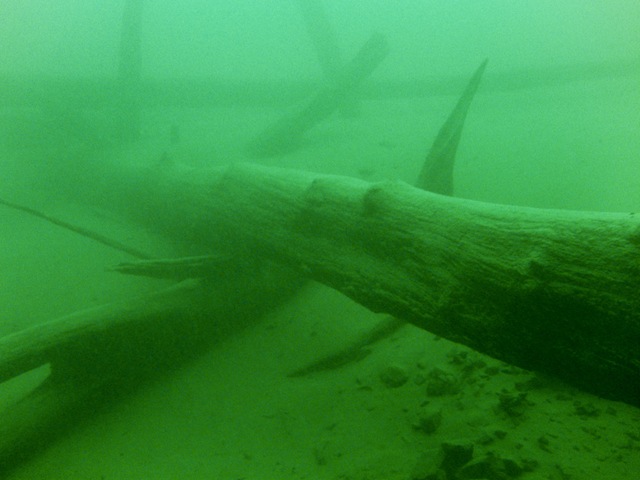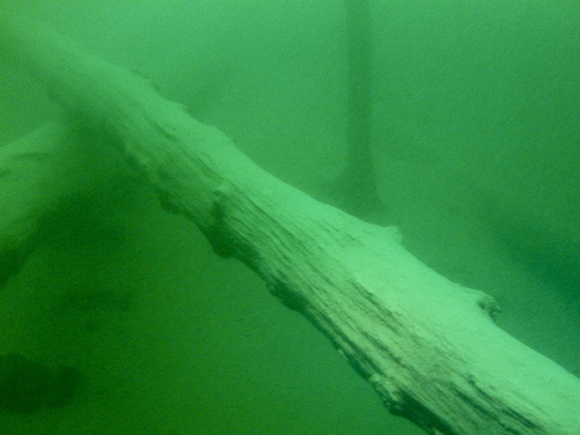 Bin also bei Nebel am Attersee zum bekannten Tec-Tauchplatz Ofen gefahren. War natürlich alleine, so hatte ich genügend Zeit, mich auf den Tx-TG auf 65m für 20 Min Grundzeit vorzubereiten. Gegen 10 Uhr 30 bin ich dann mit Gasen Tx17/40, Decogas1 Tx32/20 u.100% O2 zum Check auf 5m zum Boot, an dem an einer Stange, seit neuestem ein Spiegel angebracht ist, getaucht. Alles war Ok. Der Abstieg zum Kamin geht von dort schräg nach links bis ca. 40m. Habe nochmals alles geordnet und bin schräg nach rechts eines dort liegenden Baumstammes gefolgt und bei 56m an die Oberkannte der Wand gekommen.