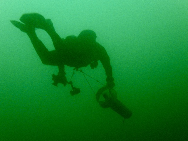 Volker und ich tauchen vor, dicht gefolgt von Kurt, Fritz und Jürgen. Das Schlusslicht macht der unsichtbare Taucher, der eine mächtige Schlammwolke aufwühlte! ![]()