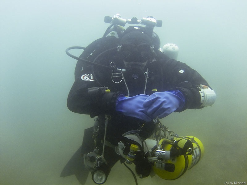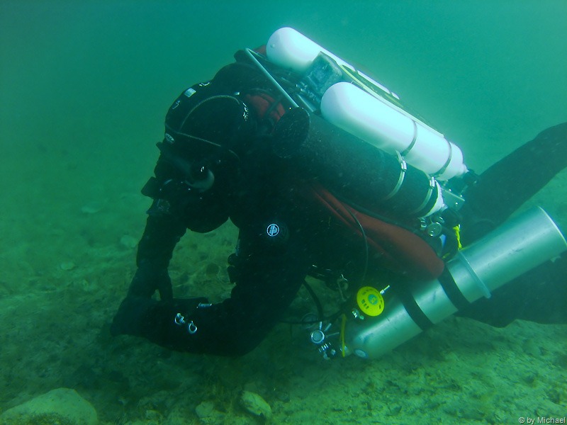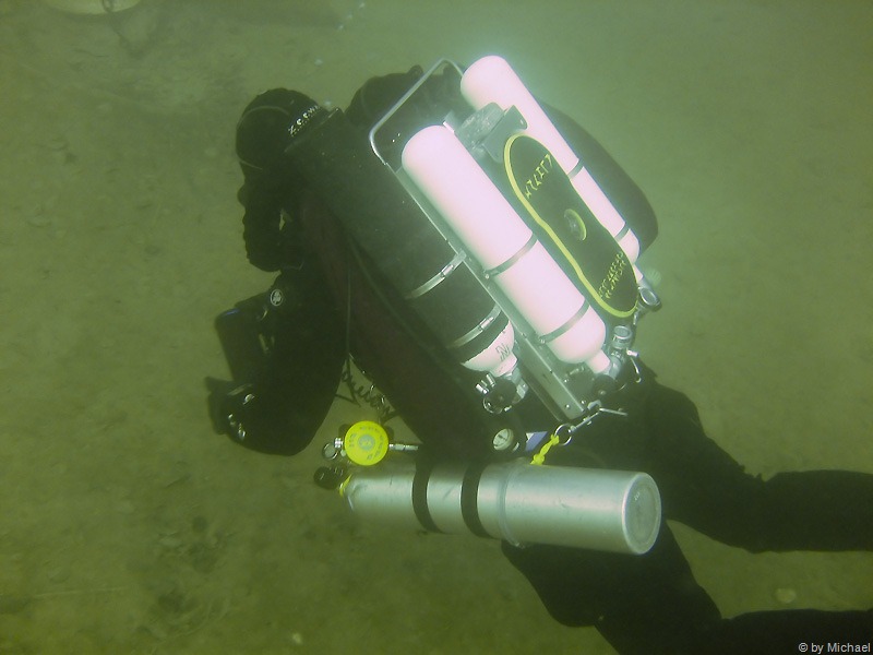Christoph trainiert gerade wieder etwas für seine Höhlentauchgänge und nimmt, für diesen Tauchplatz doch etwas unüblich, 4 Stages mit ins Wasser!
