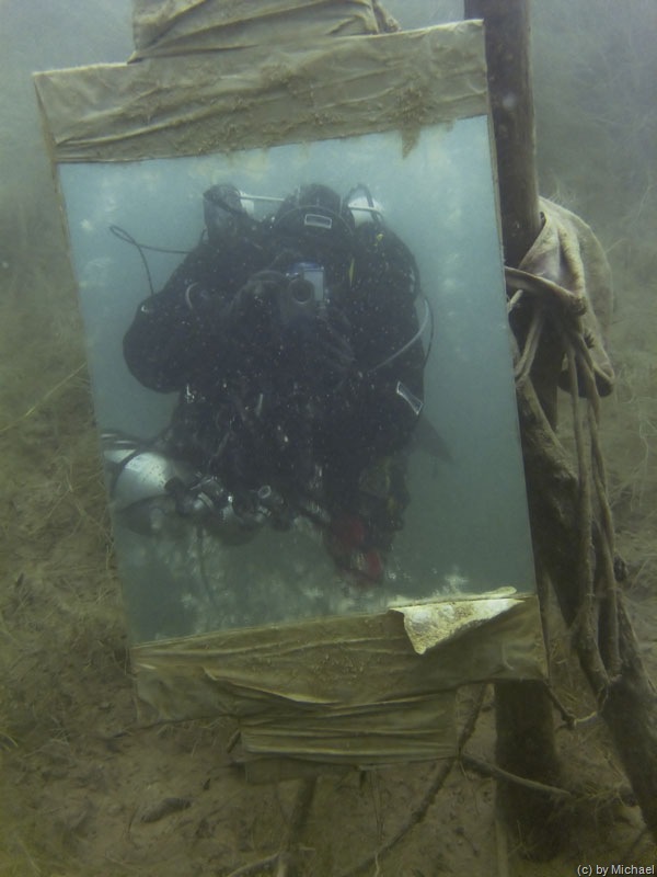 Wie vereinbart machen Kurt und ich im 5m-Bereich unseren Blasencheck, bevor es weiter abwärts geht. Wer sich auf seinen Buddy nicht verlassen will, kann sich auch selbst checken bei dem in dieser Tiefe aufgestellten Spiegel.