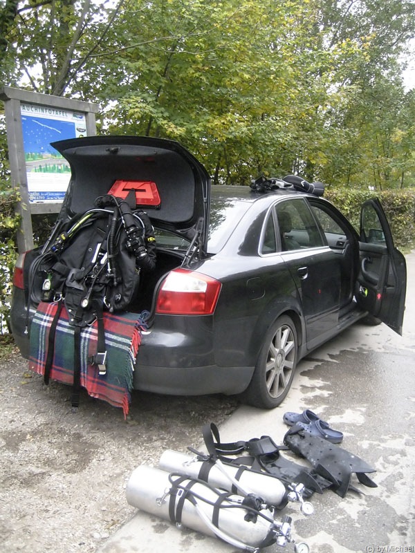 Ein Tauchgang mit Volker im “normalen” Tiefenbereich bis 32m, dafür eine etwas verlängerte Grundzeit von knapp 60 Minuten. Wir haben an diesem schönen sonnigen Tag nicht als einzige die Idee hierher zu kommen. Der Parkplatz ist schon ziemlich voll, und er sollte sich im laufe des Tages zur Gänze füllen.