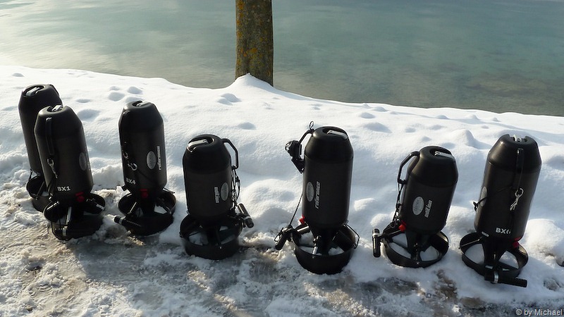 Nach dem theoretischen Teil geht es dann ab zum nahen Tauchplatz Hinkelsteine. Wir wollen die Scooter ja auch Probefahren. Zur Verfügung stehen der Edition, der Reference und der Reference RS.![]()