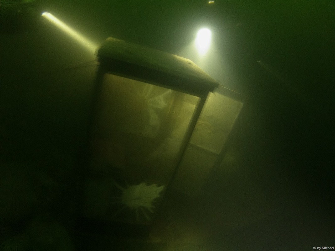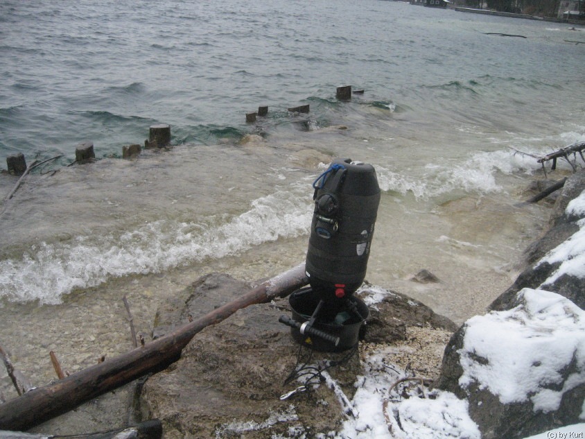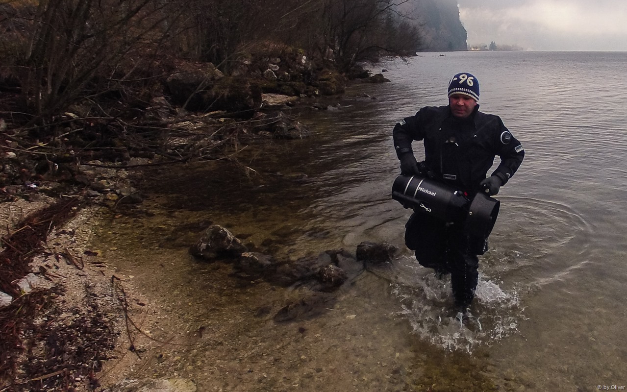 Der Einstieg führte über eine Treppe zum Wasser,war aber ziemlich vereist. Für den See herrschte ein ziemlicher Wellengang. Ausgerüstet mit Doppel 7 und einer 10L Stage fuhr ich mit dem Scooter in 20m Tiefe in Richtung Europabad, in der Annahme auf eine mir bekannte