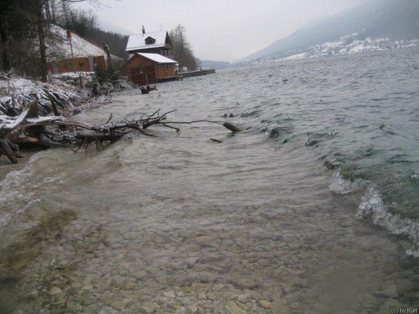 Nach 35 min Tauchfahrt in nördlicher Richtung war mir die Unterwasserlandschaft unbekannt.Nach einem Deco u. Sicherheitsstop tauchte ich auf, ich traute meinen Augen nicht ,ich war kurz vor Weißenbach gelandet. In einer Tiefe von 10 Metern habe ich dann beide Plattformen bei der Rückfahrt gefunden. Nach einer Tauchzeit von74 min beendete ich den Scooter-Test. Inzwischen war es noch kälter geworden ,wie man an der vereisten Stage sehen kann.