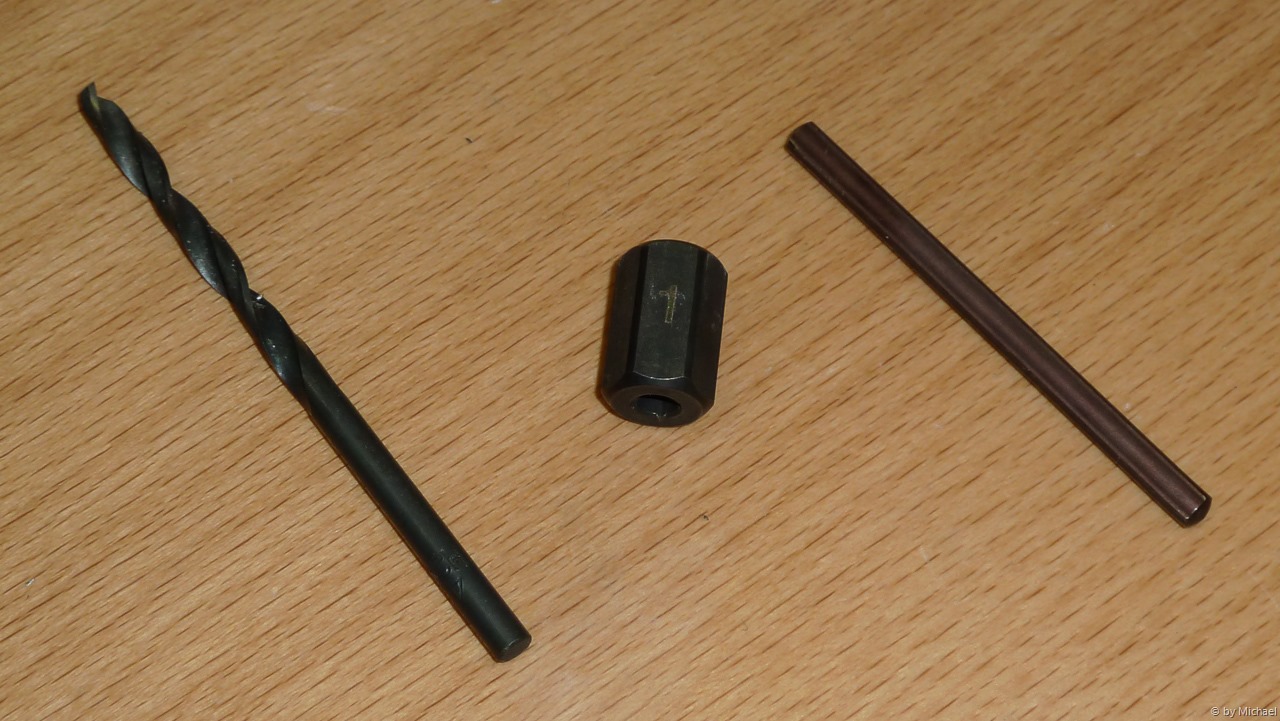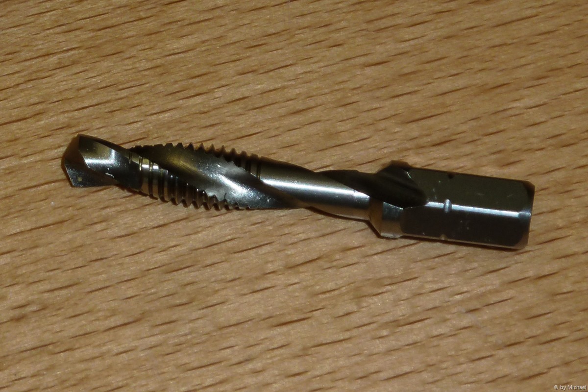 Das Gewinde habe ich an einer Seite leicht beschädigt, aber mit meinem Gewindekernlochbohrer M6 für Edelstahl kann ich das Gewinde rasch wieder nachschneiden. Die neue Schraube beißt wie am ersten Tag!