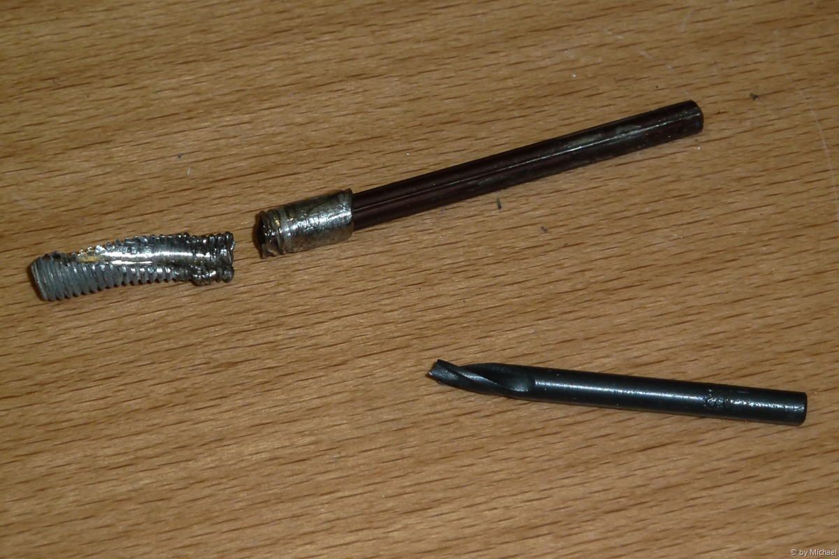 Ich mache mich voller Optimismus an die Arbeit. Gefühlte Stunden später – und einem gebrochenen Bohrer – habe ich es endlich geschafft, das Gewinde ist draußen. Endlich kann ich etwas aufatmen.