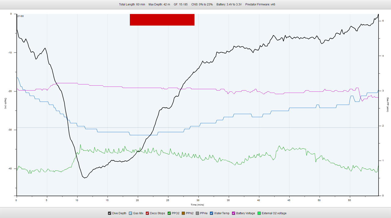 Wir tauchen mit Luft als Diluent und vereinbaren eine maximale Tiefe von 40m.