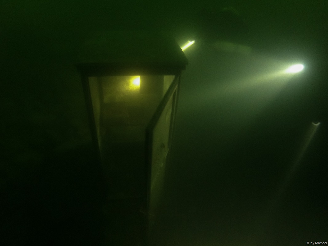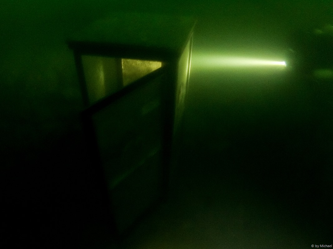 Nach etwa 45 Minuten Tauchzeit auf etwa 22m erreichen wir ca. 10 Minuten später als erwartet die Telefonzelle. Wir waren schon kurz davor umzukehren, als sie vor uns auftaucht.