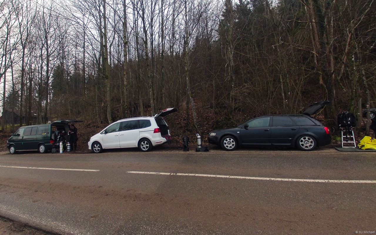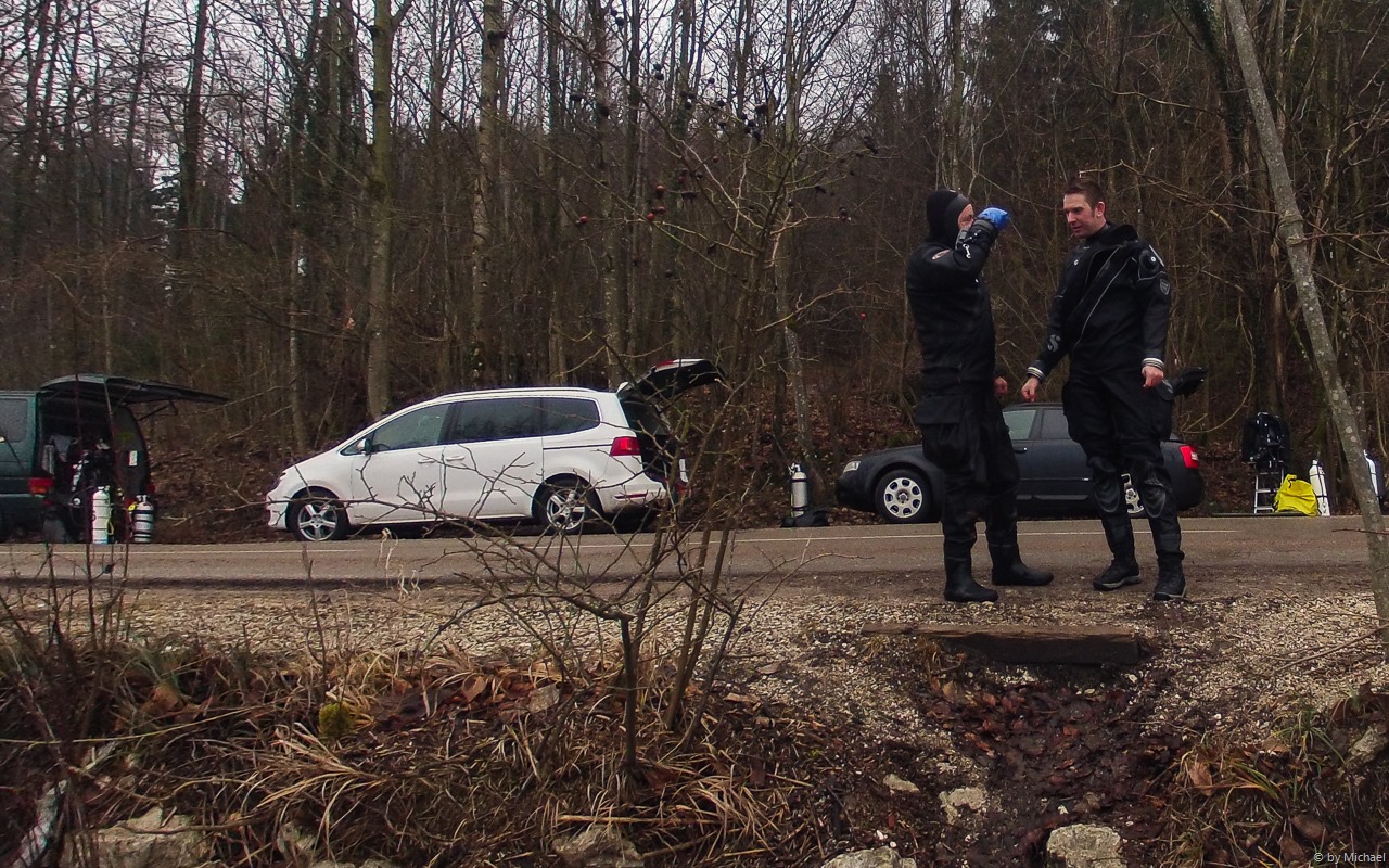 Wir fahren um 11:00 Uhr ab und haben keine Probleme am Kreuzstein Parkplätze zu finden – wir sind alleine. Wir bereiten unsere Tauchausrüstung auch gleich vor.