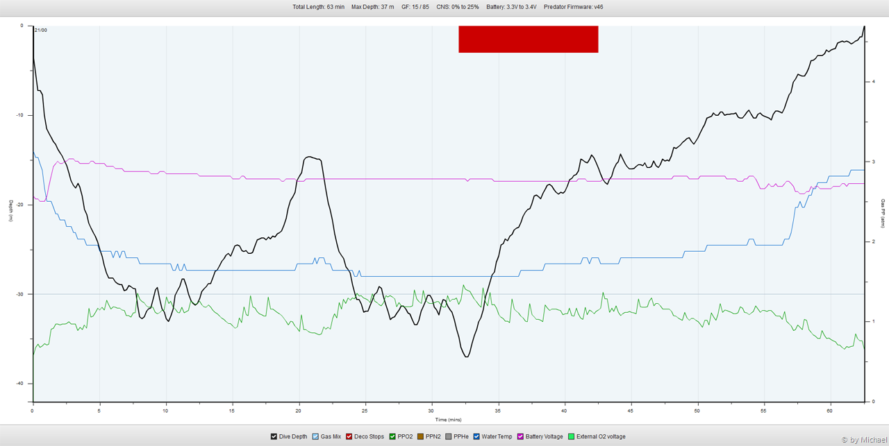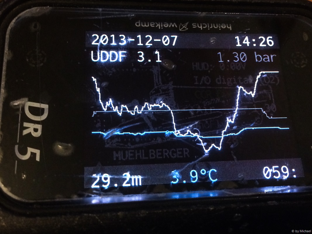 In der Basis eingetroffen finde ich Volker schlafend vor. Er wartet schon fertig vorbereitet auf der Couch. Ich richte meine Tauchausrüstung zusammen und wir fahren kurz darauf zum Tauchplatz Hinkelsteine. Um 17:32 Uhr tauchen wir gemeinsam ab. Wider erwarten haben wir doch noch Tageslicht für unseren Tauchgang.
