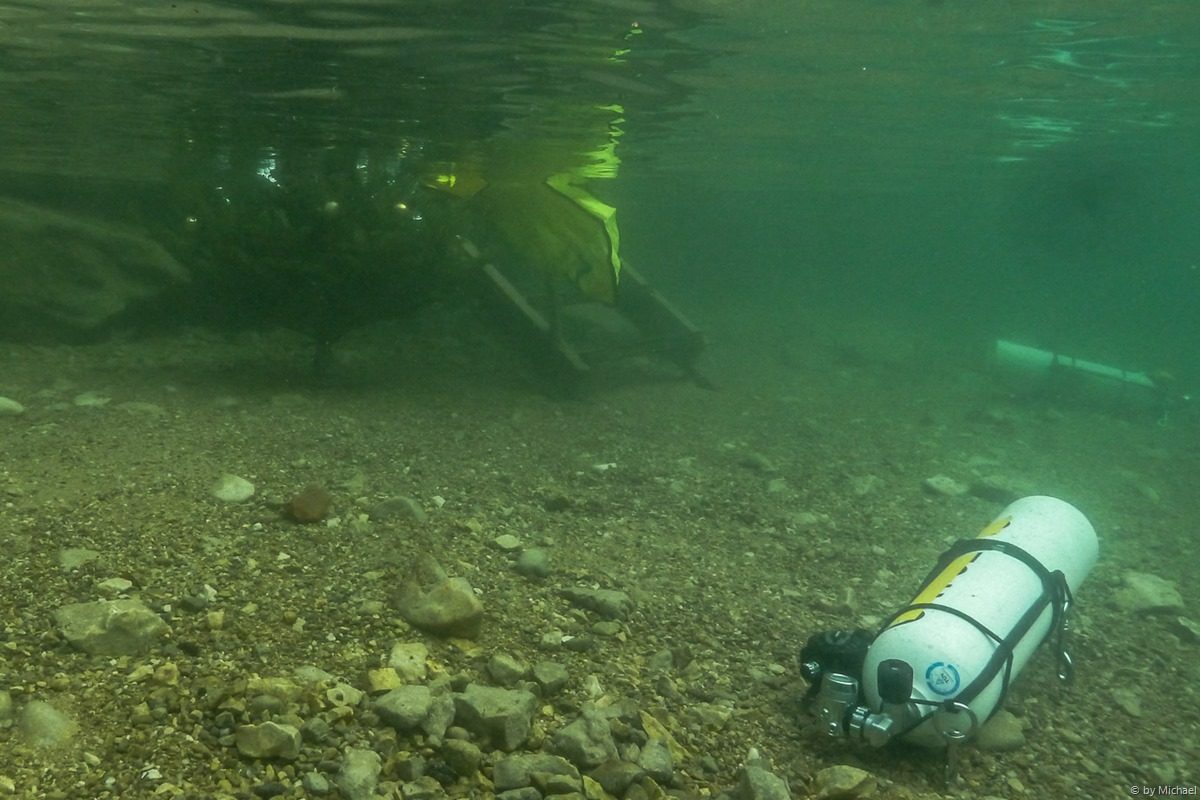 Beim Abtauchen bis ca. 6m begleitet mich ziemlich schlechte Sicht, darunter ist sie im Vergleich zu den Tauchgängen nach dem Hochwasser schon sehr gut. Ich Scootere gemütlich zu den Hinkelsteinen und darüber hinaus. Nach etwa 30 Minuten kehre ich um und beginne höher zu steigen, um nach 65 Minuten das Wasser zu verlassen. Dabei lächelt mir Elisabeth schon entgegen.