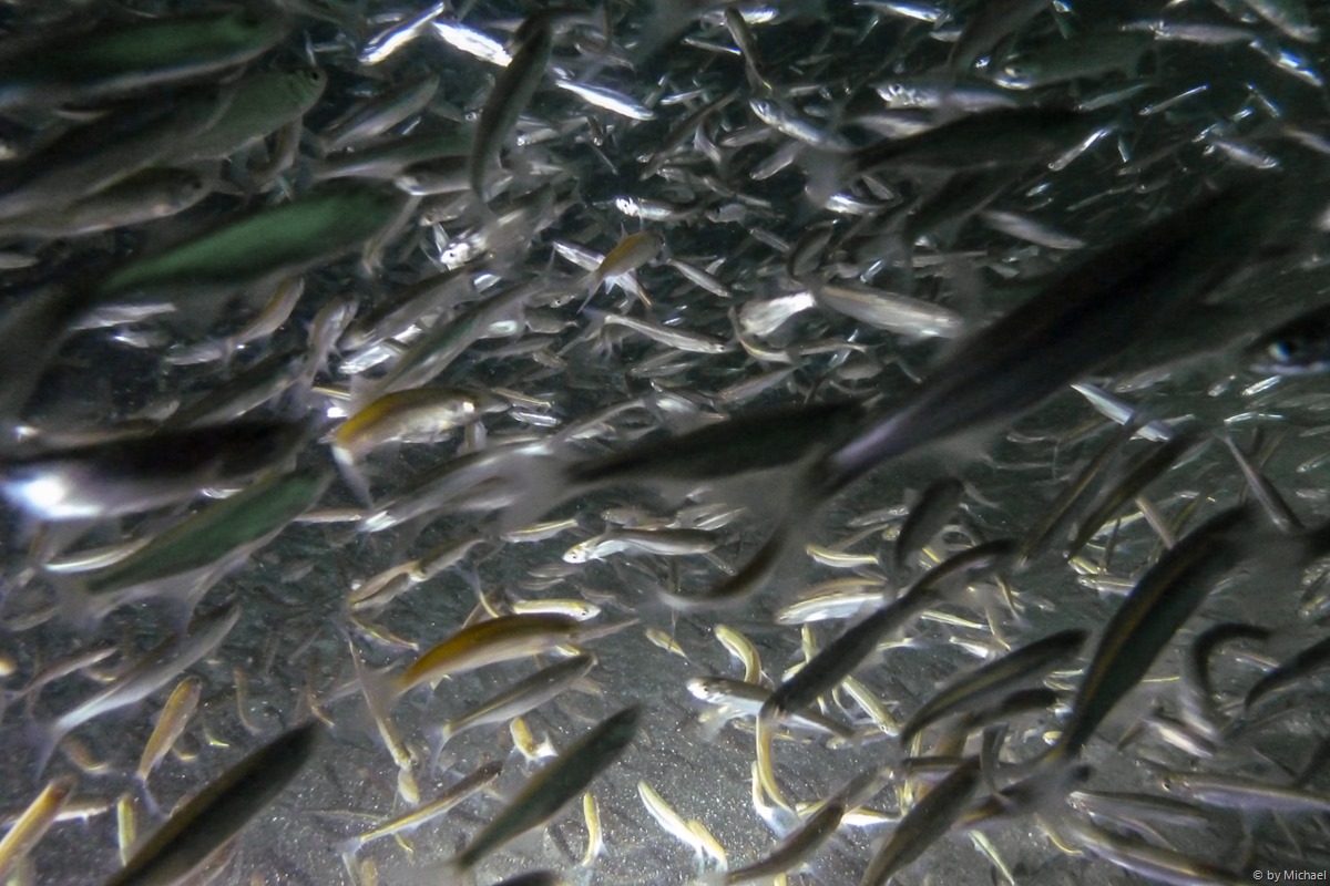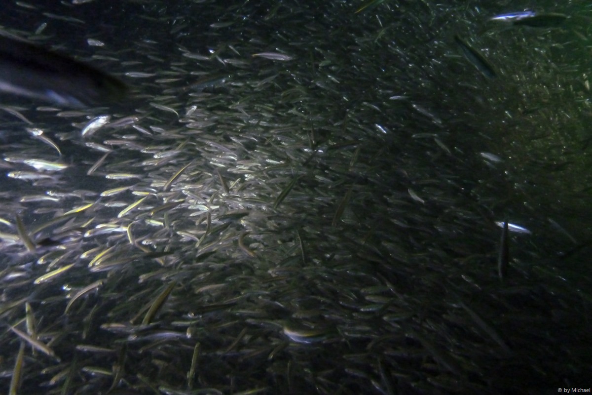 An den Hinkelsteinen erwarten uns riesige Fischmassen. Ein Fischschwarm mit hunderten kleinen Fischen fühlt sich dort wohl und lässt sich von uns nicht stören. Wir tauchen mitten durch die Fische durch. Oliver hat einen Film davon – er war vor einer Woche hier und hat seinen Tauchgang gefilmt.