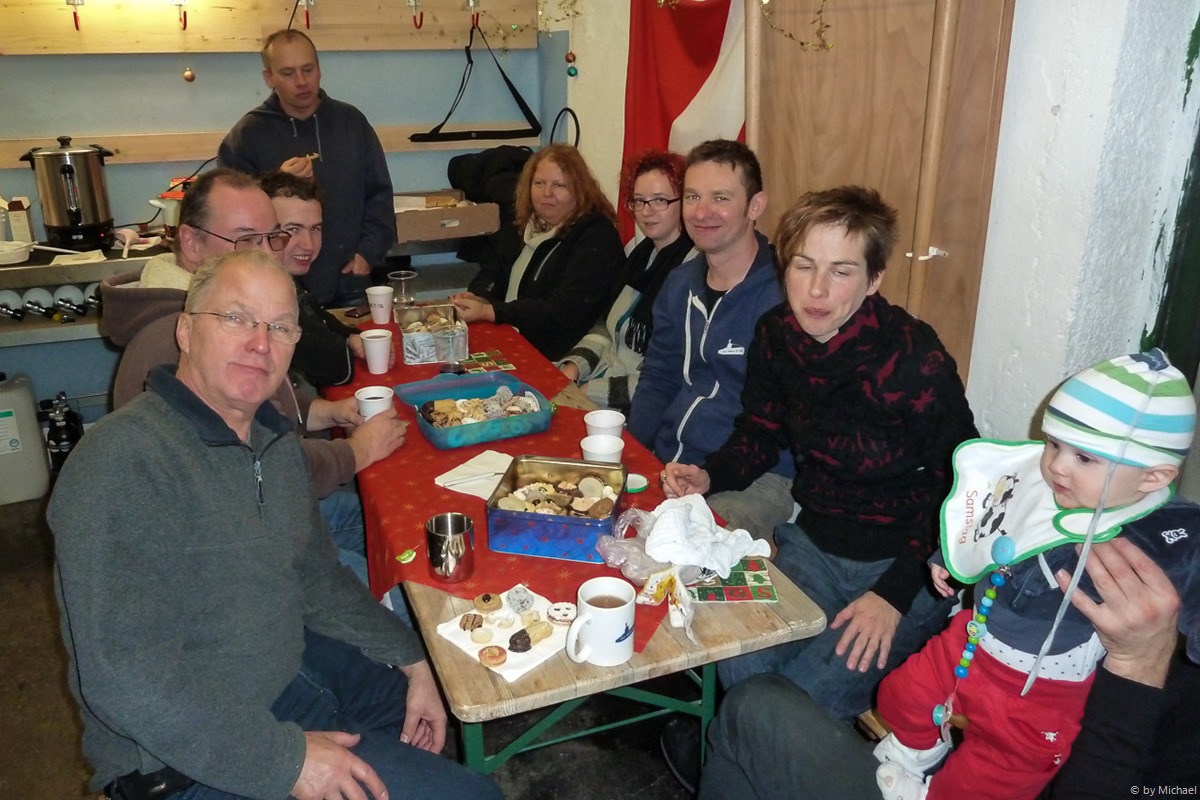 Wieder zurück erwarten uns schon Glühmost, Glühwein, Frankfurter, Debreziner, Schinkenstangerl und leckere Weihnachtskekse – dank Elisabeth schon alles auf Betriebstemperatur! 🙂