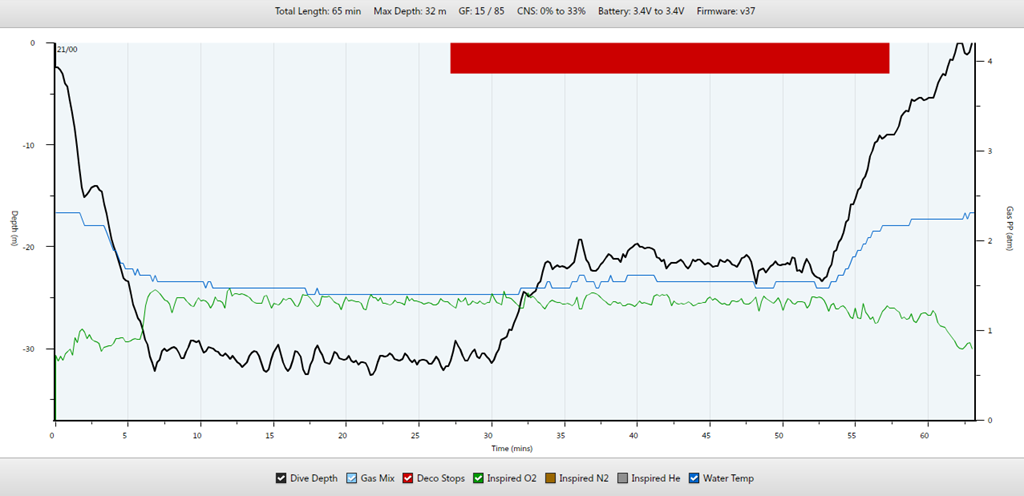 Nach 30 Minuten Grundzeit auf 30m kehre ich um und beginne mit dem Aufstieg. Diesen bremse ich bei 20m ab, da hier die Sicht wieder gegen 0 geht – und bleibe eine Zeit lang auf 22m für den Rückweg. Ich muss mich schon einigermassen auf die Umgebung konzentrieren, damit ich die Orientierung nicht verliere – und doch sehe ich heute so viele Fische wie lange nicht mehr.