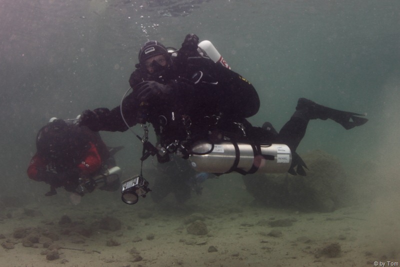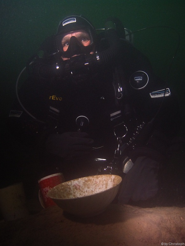 Beide Buddyteams bleiben meisten in Sichtweite der Scheinwerferkegel. Am Ende des Tauchgangs finden sich alle wieder bei der Zille am Einstieg wieder, um die restliche Dekozeit gemeinsam abzusitzen. Auf Grund des Wiederholungstauchganges (bei Kurt, Volker und mir) fällt diese doch um etwa 12 Minuten länger aus.