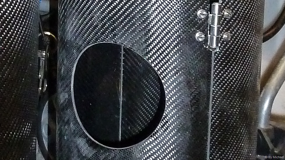 Zuerst schneide ich das letzte größere Loch in die Carbonröhre – für’s ADV. Mein Akkubohrer von Bosch gibt natürlich nach der Halbzeit auf und will seinen Akku laden! Aber das verzögert die Arbeit nur etwas.