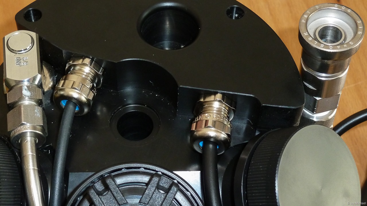 Das einbinden der 2 Kabel für die Elektronik-Box und das HUD in den Kopf erfolgt über die Blueglobe Quetschdichtungen.