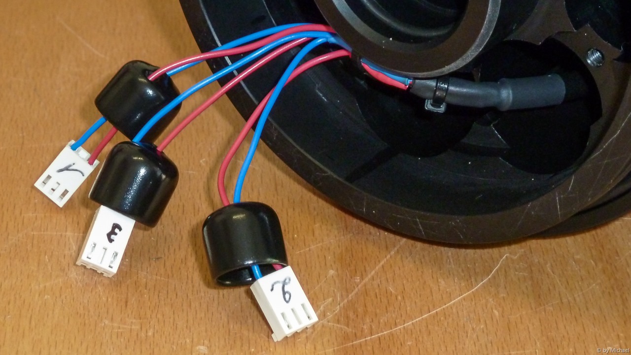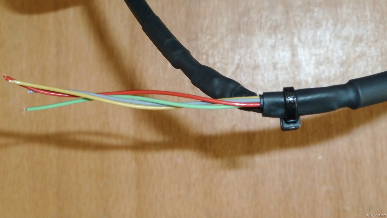 Nun können die eigentlichen Sensorstecker an die restlichen 4 Adern gelötet werden (Grau, Gelb, Rot und Grün). Vorher noch die Schutzkappen einfädeln.