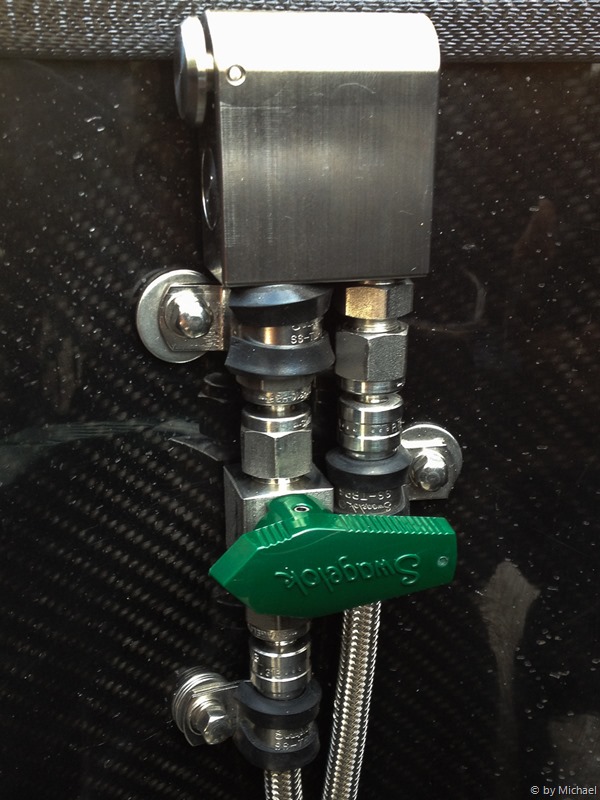Zwecks Bequemlichkeit beim Scootern, und um nicht nach hinten greifen zu müssen beim Boostern, habe ich mir ein MAV im rechten Brustbereich installiert in meinem Fall ist es das von Paul geworden. Es hat auch eine Gaseinspeisung mit Inflatorkupplung. Ich habe zwar für die externe Einspeisung primär eine Swageloc QC-6 Kupplung für die Bottom-Stage um im Notfall durch aktivieren des BOV meine ganze Stage ohne Reglerwechsel und Umstöpselei sofort zur Verfügung zu haben, aber es gibt ja auch Buddys die mit Inflatorkupplungen unterwegs sind.