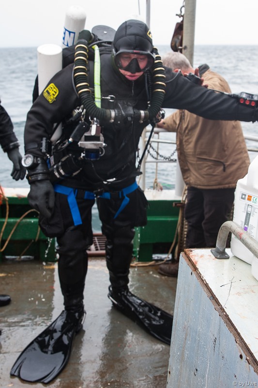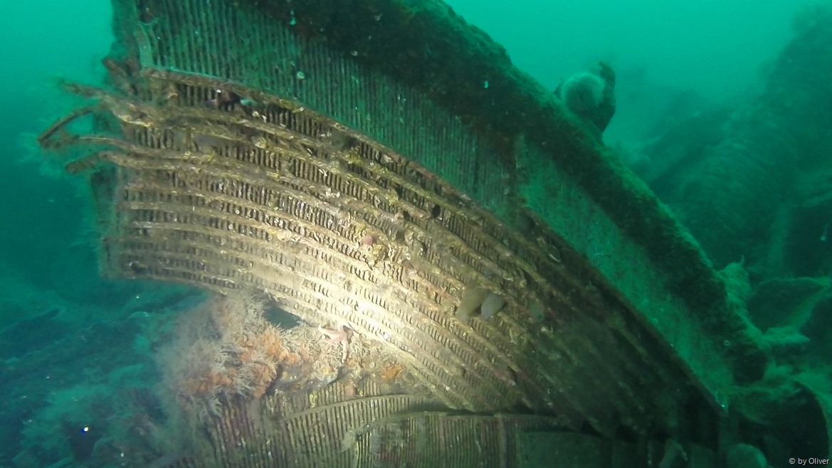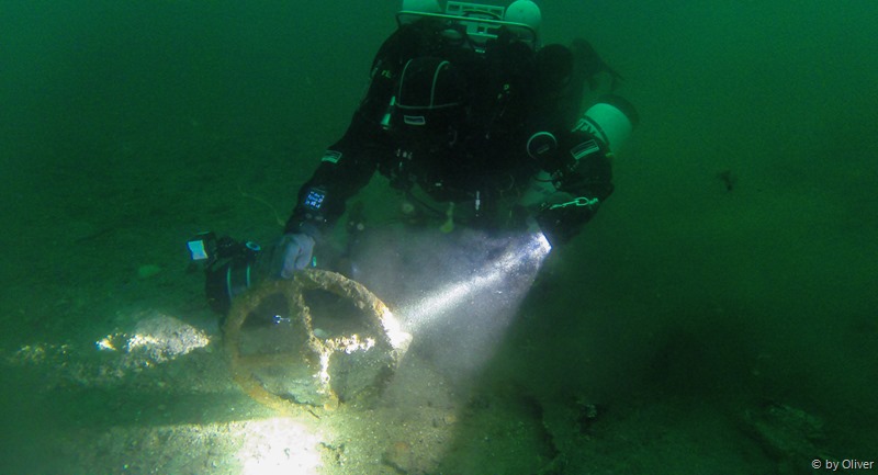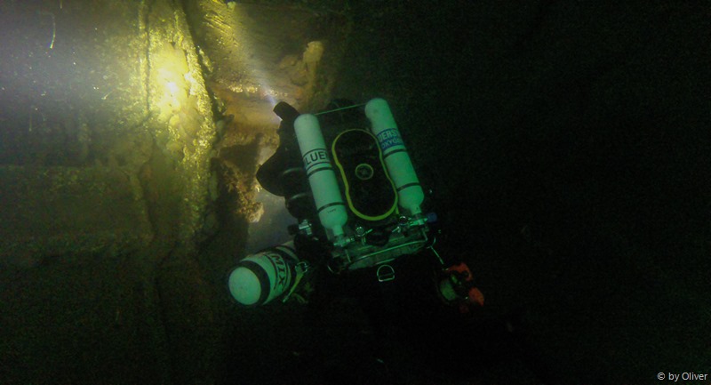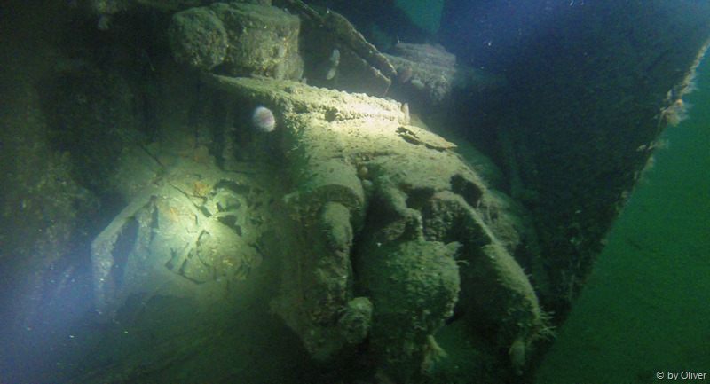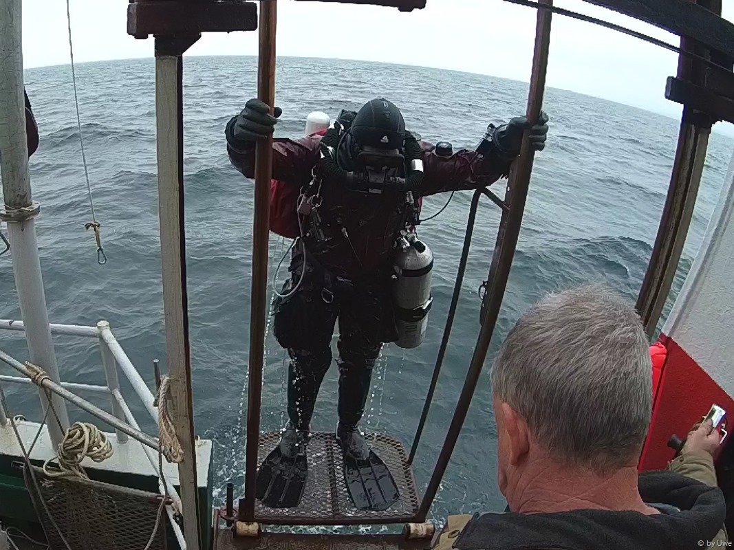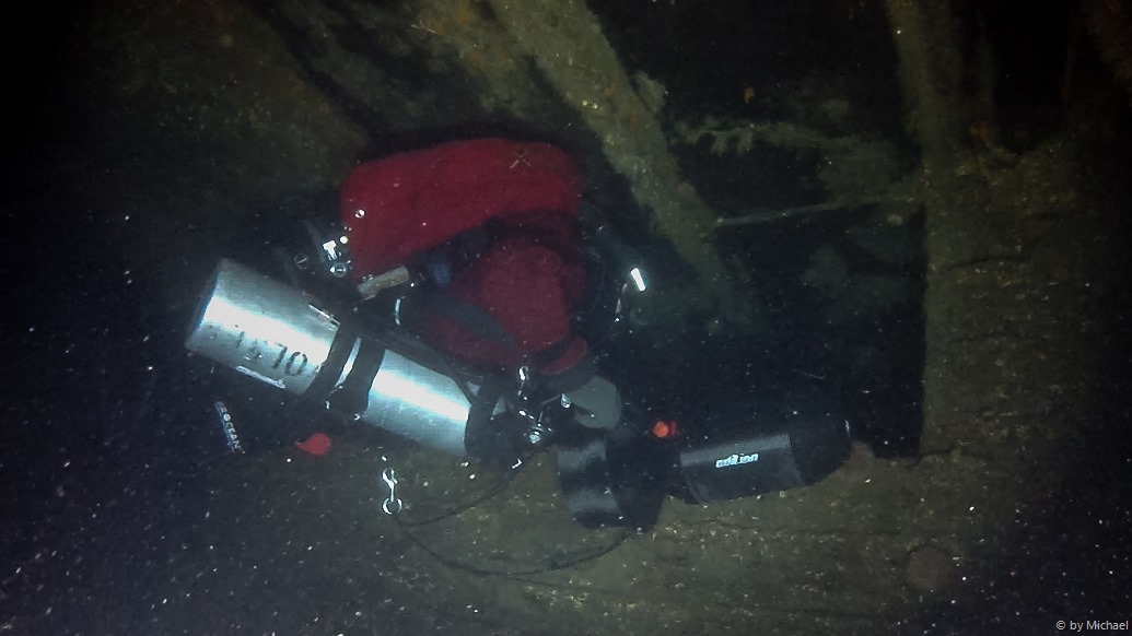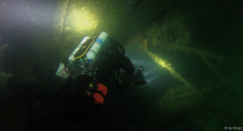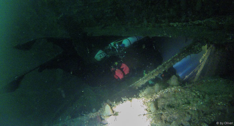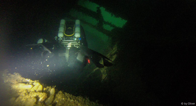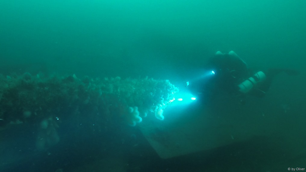 Der Tauchgang verläuft planmäßig. Wir springen um 11:18 Uhr ins 7° warme Wasser, tauchen an der Bojenleine ab und betauchen das Wrack. Für diesen Tauchgang haben wir ein EAN28 in unseren Doppelflaschen, das eigentlich für die SMS Marktgraf gedacht war.