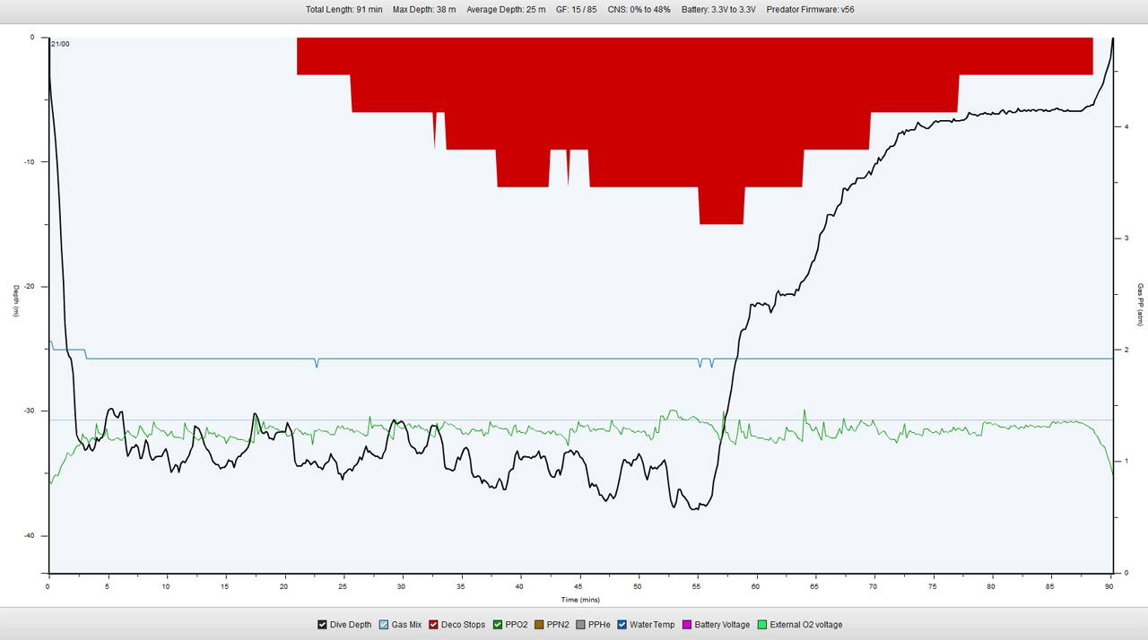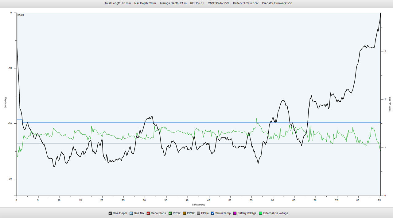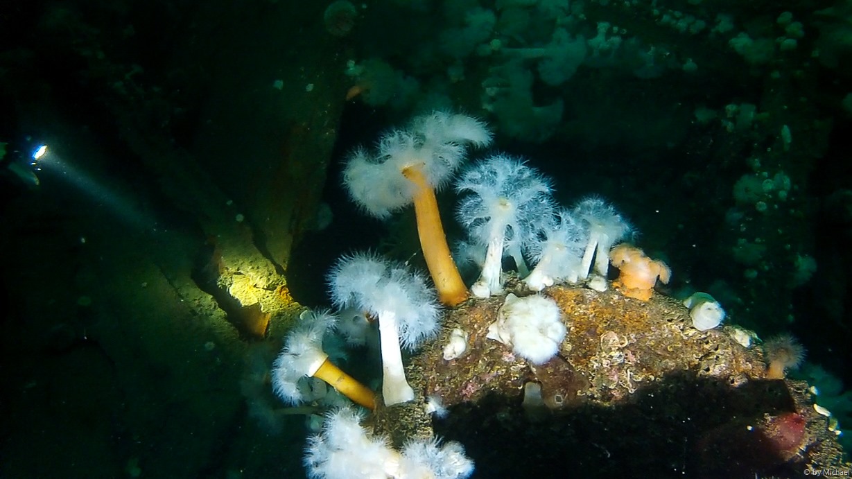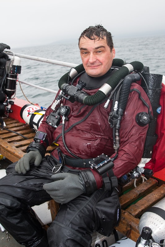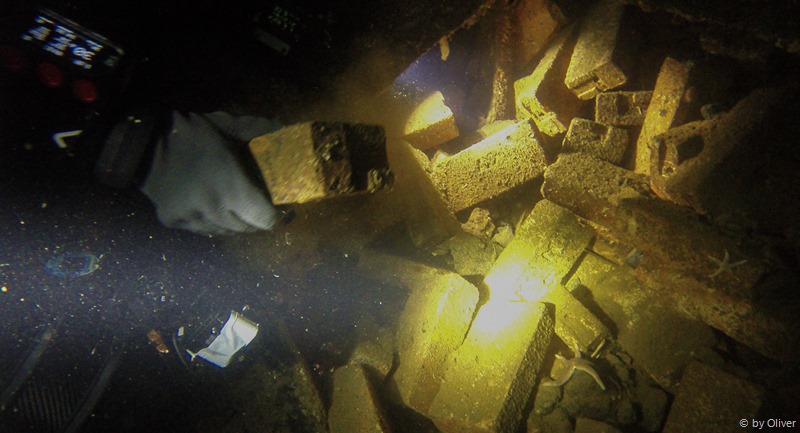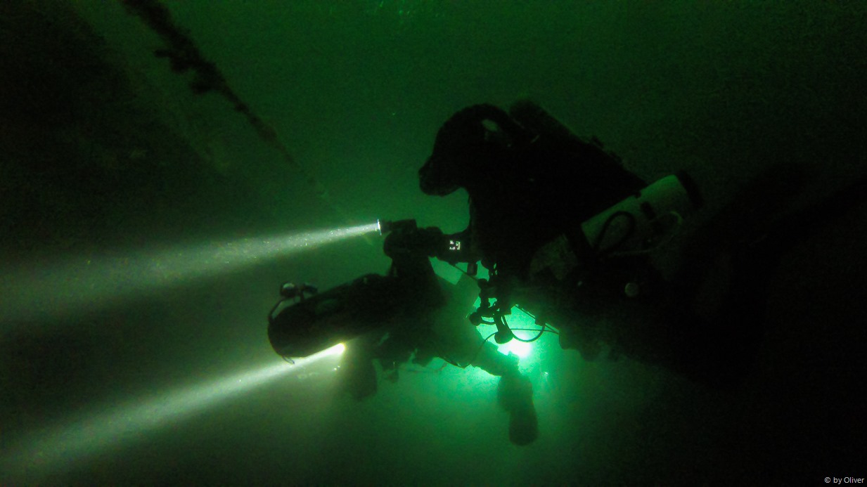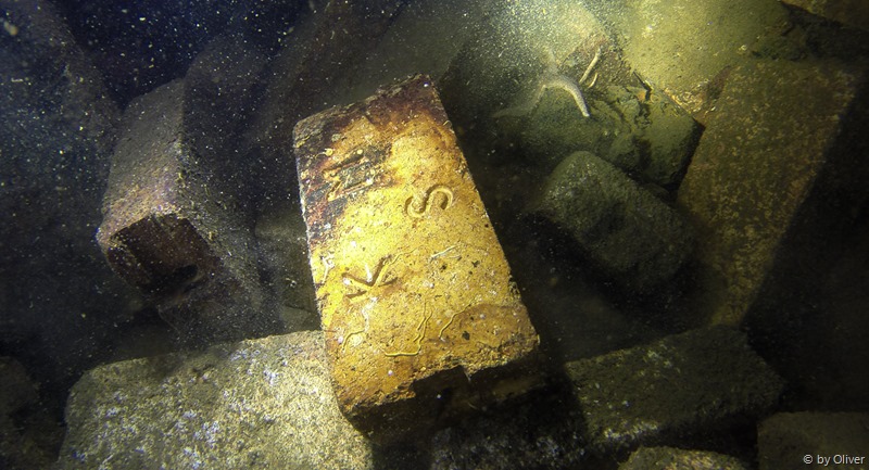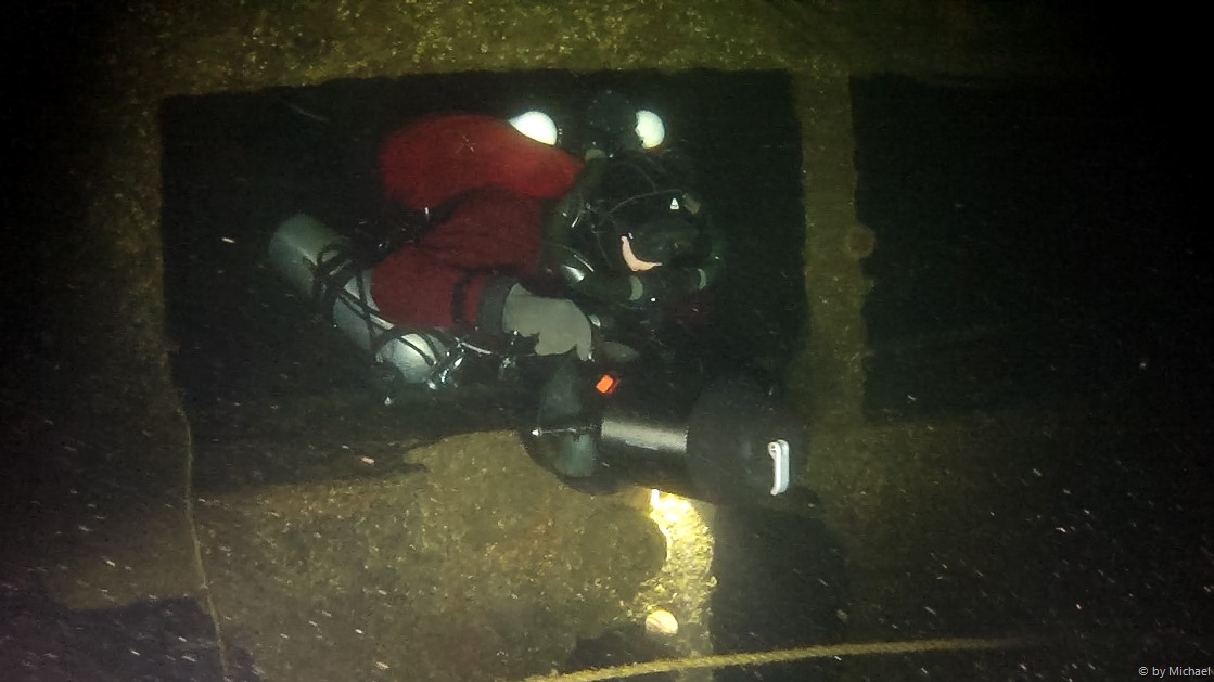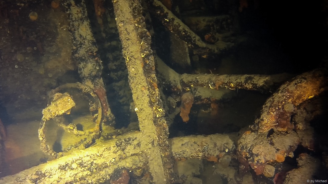 Der Tauchgang verläuft planmäßig. Wir springen um 11:18 Uhr ins 7° warme Wasser, tauchen an der Bojenleine ab und betauchen das Wrack. Für diesen Tauchgang haben wir ein EAN28 in unseren Doppelflaschen, das eigentlich für die SMS Marktgraf gedacht war.