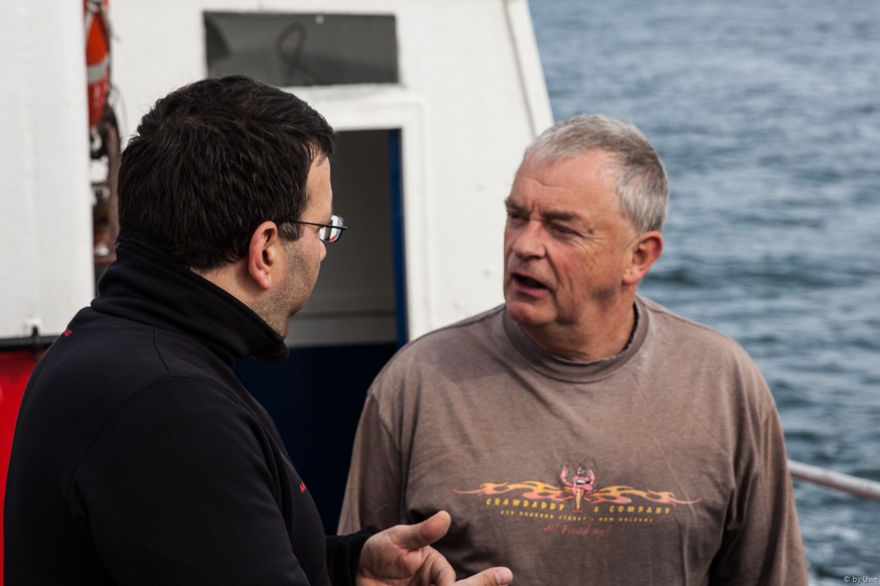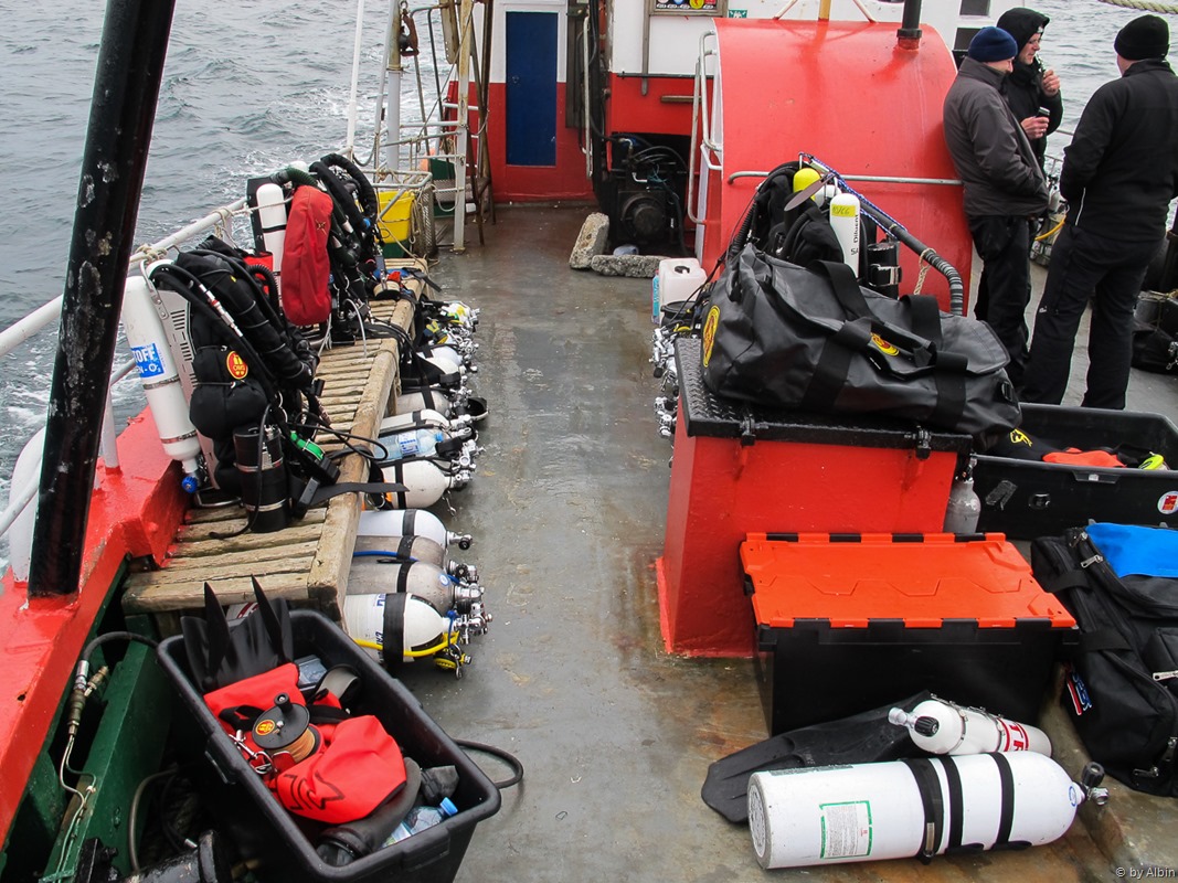 Zurück an Bord verstauen wir unsere Ausrüstung. Durch den starken Wellengang löst sich leider Kurts Knoten vom Sicherungsseil und sein Doppelpack fällt Kopfüber von der Sitzbank aufs Deck. Glück im Unglück – es sind nur Die Welle des Reglers verbogen und der Backupinflator zerbrochen. Kurt entfernt sanft seinen defekten Regler und montiert seinen Reserveinflator für den Nachmittag.