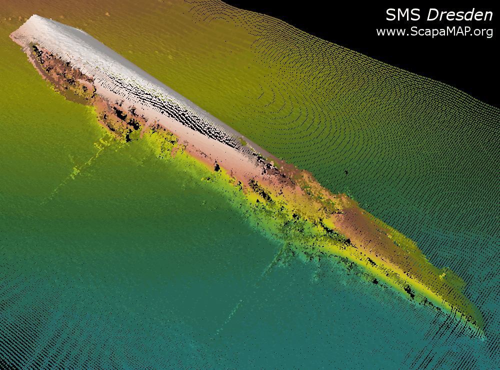 Am Nachmittag tauchen wir an der SMS Dresden, einem Kleinen Kreuzer in 30m Wassertiefe, das auf der Backbordseite liegt und bis auf 16m heraufragt.