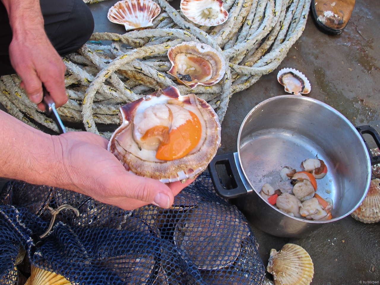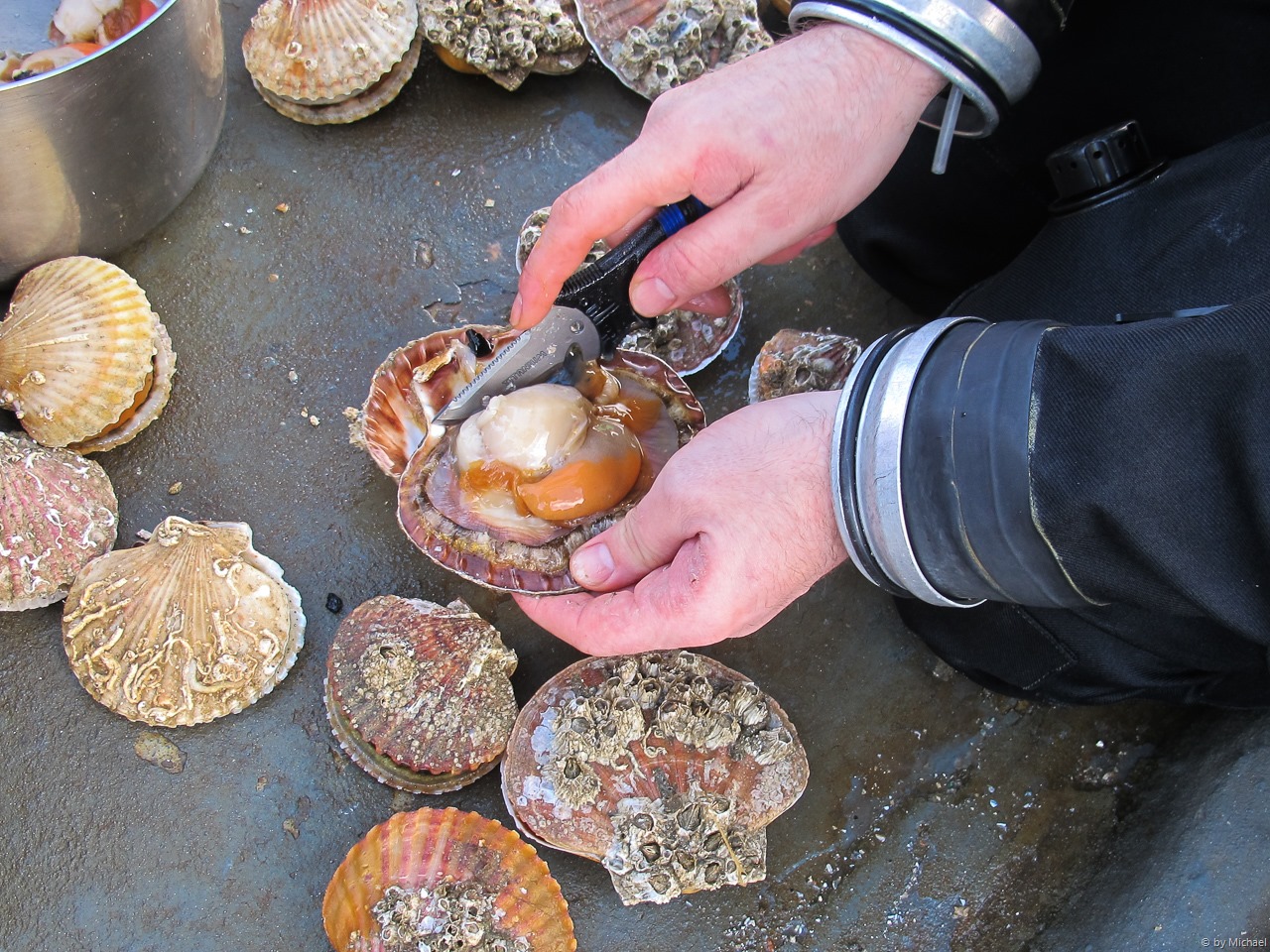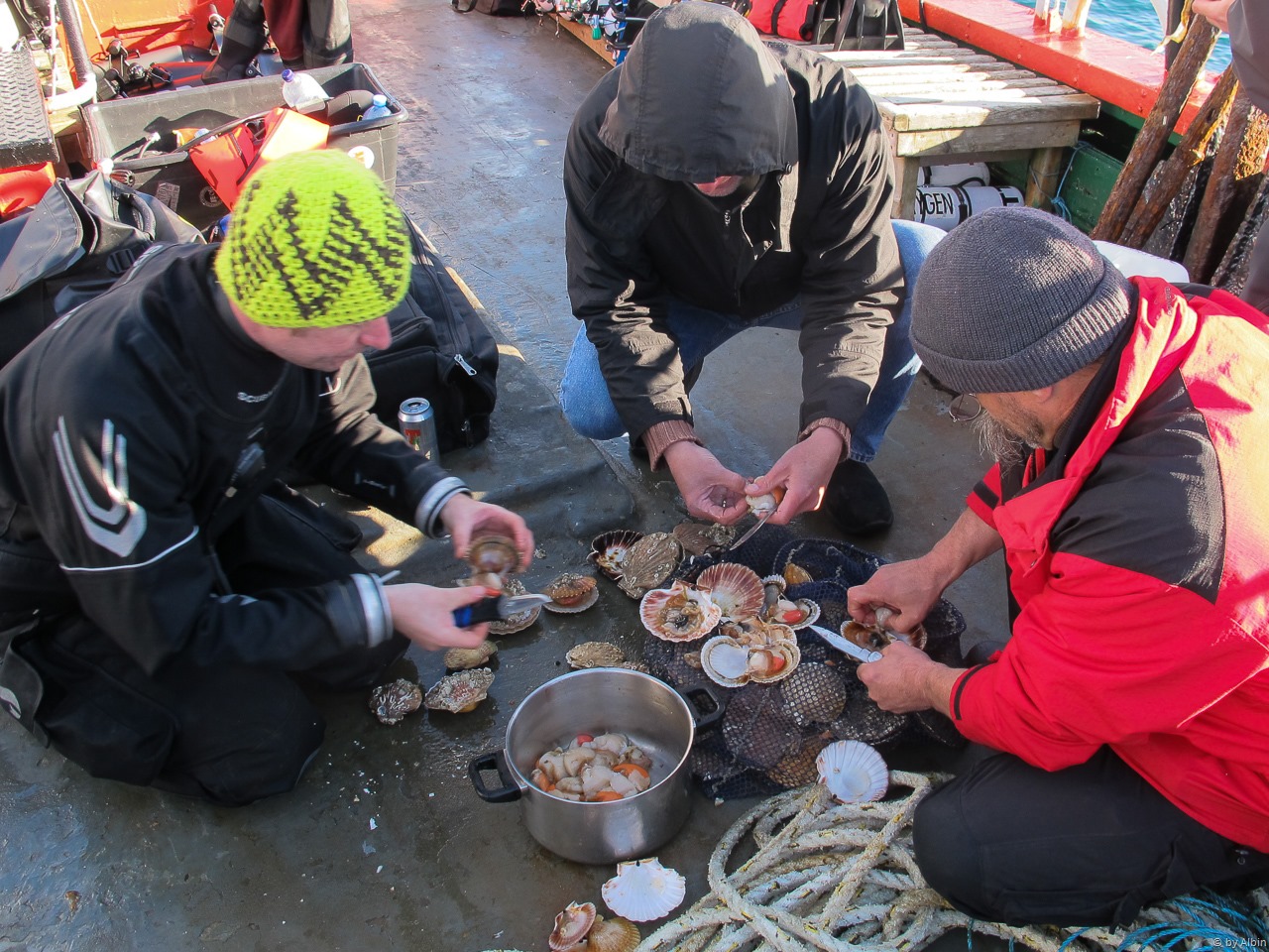 Am Ende der Wrackbesichtigung machen wir uns noch auf die Suche nach Jakobsmuscheln, sind hier jedoch nicht vom Glück gesegnet und kommen mit leeren Händen zurück.