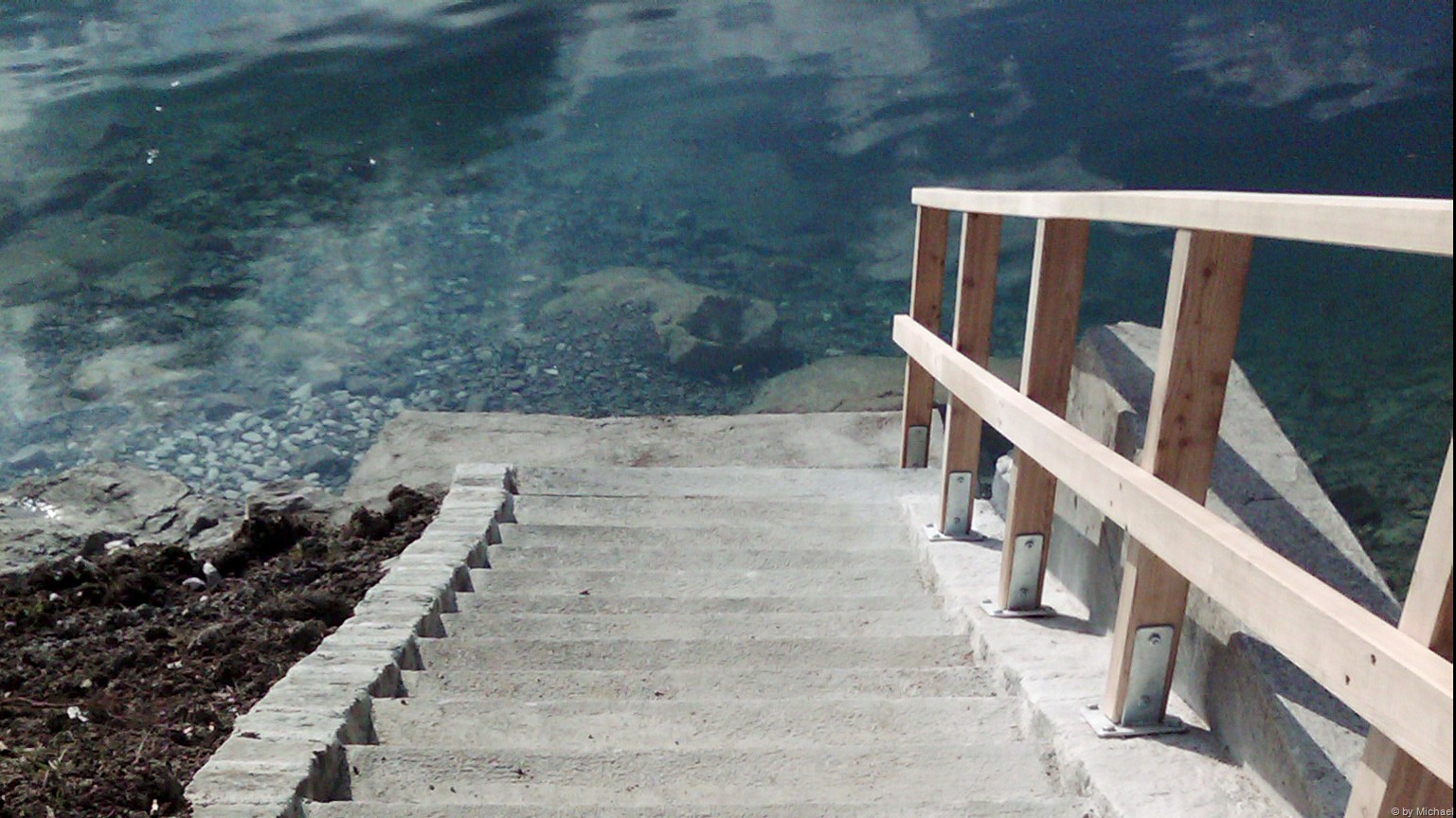 Bubble Check bei schlechter Sicht (ca. 2m), dann geht’s weiter hinab. Nach 4 Minuten erreichen wir unsere Zieltiefe von 42m. Die dort herrschenden 4° Wassertemperatur sind eine richtig willkommene Abkühlung zur Hitze an der Oberfläche. Auch die Sichtweiten sind hier unten wesentlich besser. Wir tauchen die Wand entlang, besuchen die Madonna und an der Schwarzen Brücke vorbei. Volker und ich genießen die Grundzeit, bis wir nach 60 Minuten umkehren und mit dem Aufstieg beginnen. Dieser dauert etwa weitere 60 Minuten. Ab 18m beginnt die Sicht wieder deutlich schlechter zu werden – dafür wird es wieder wärmer. Nach etwa 105 Minuten Tauchzeit tauchen wir im 6m Bereich am Einstieg der Schwarzen Brücke vorbei. Dieser lässt sich leicht erkennen, da von der Stiegenbaumaßnahme noch einiger Bauschutt am Hang liegt. Nach 120 Minuten erreichen wir unseren Ausstieg. Wir warten noch unsere letzten Minuten Deko ab bevor wir das Wasser verlassen.