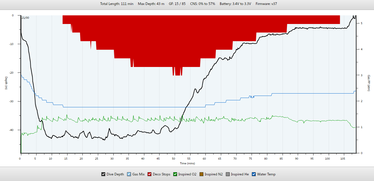 Wir steigen um 15:19 Uhr ins Wasser, tauchen ab und bleiben für etwas über 40 Minuten auf 40m. Die Wand an dem Tauchplatz ist leider bei weitem nicht so lange. Als wir den Aufstieg beginnen zeigen unsere Computer an die 55 Minuten Dekompressionszeit. Als wir aus dem Wasser steigen sind 110 Minuten vergangen.