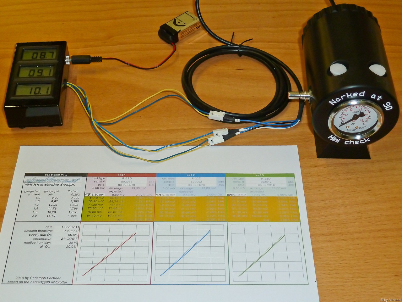 Wir prüfen bei uns in der Basis U-96 die O2-Zellen mit dem Mini-Check von “Narked at 90”. Dieses Gerät hat sich schon seit längeren bei uns bewährt.