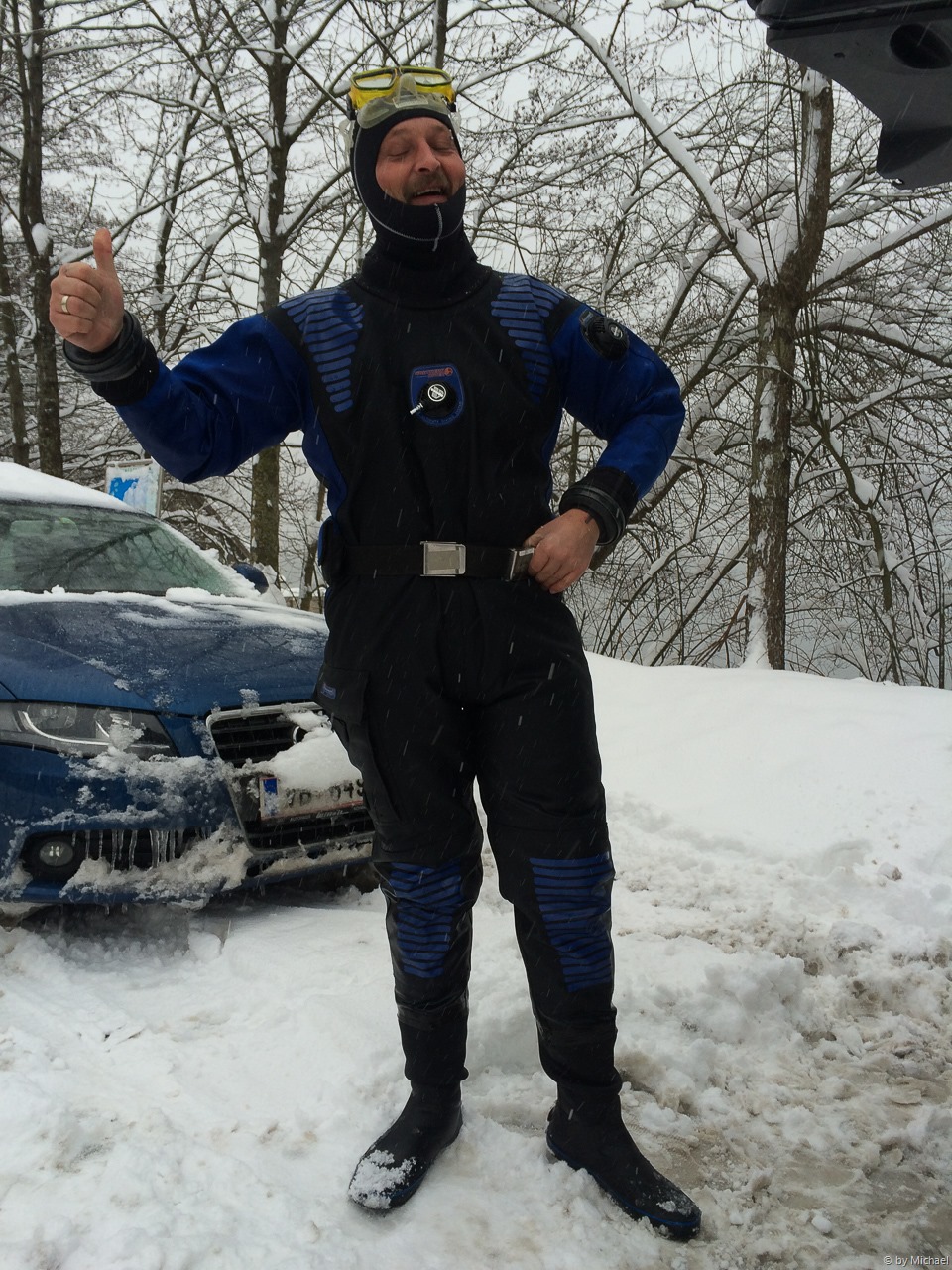 Wir warten bis ca 11:00 Uhr und es findet sich tatsächlich eine Tauchgruppe in der Größe von 5 Mann ein. Wir fahren zum Tauchplatz Hinkelsteine, wo wir entgegen Andreas’ Erwartungen (Parkplätze nicht geräumt) trotzdem vernünftig im Tiefschnee einparken können.