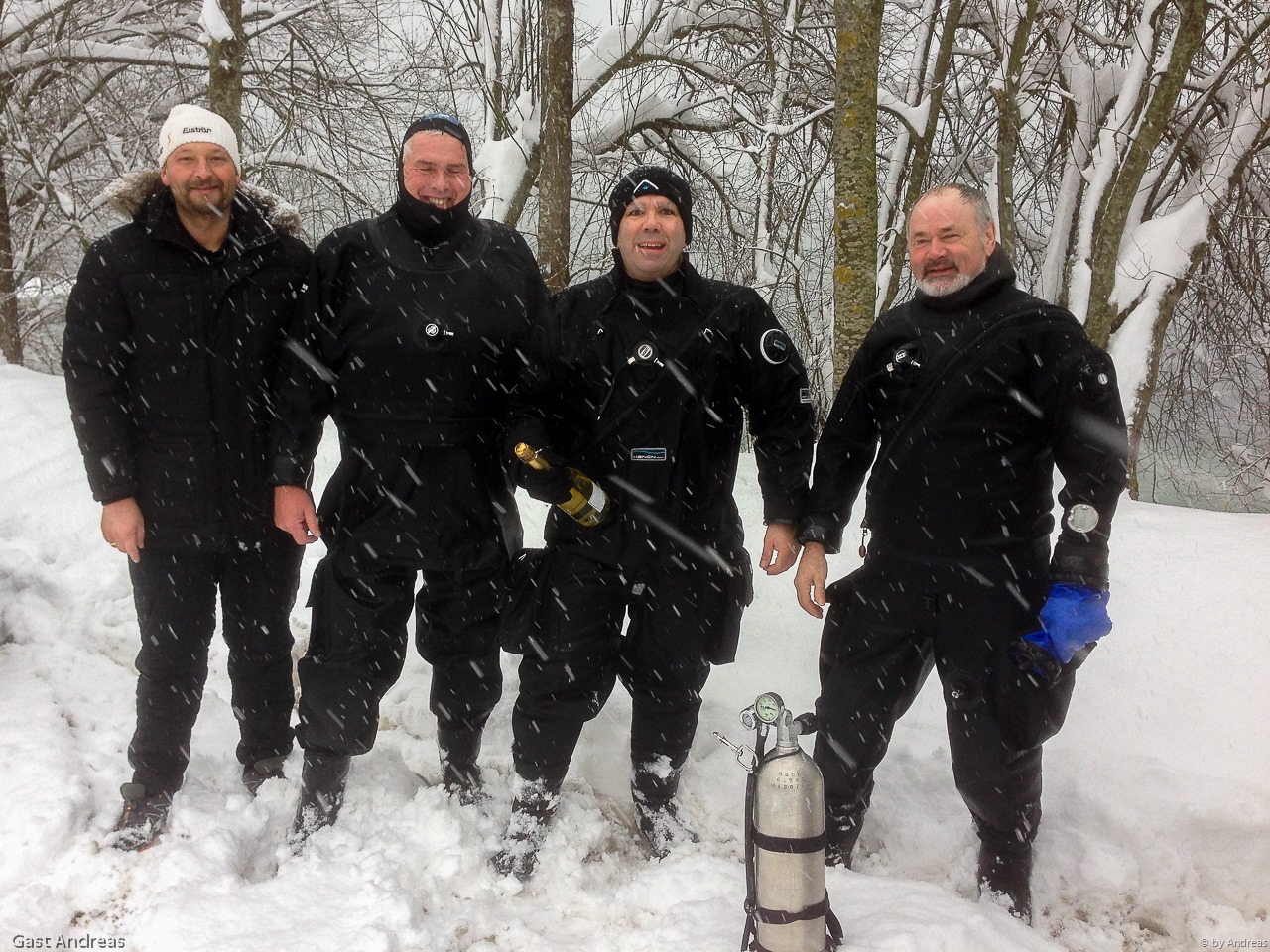 Im Anschluss genießen wir den mitgebrachten Schlumberger Sekt und die Leberkässemmeln von Andreas! Es war ein schönes Tauchjahr 2014 und wir hoffen alle auf ein weiteres sicheres Tauchjahr 2015.![]()