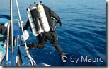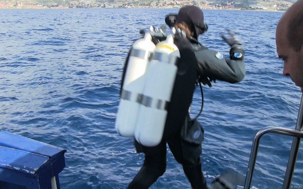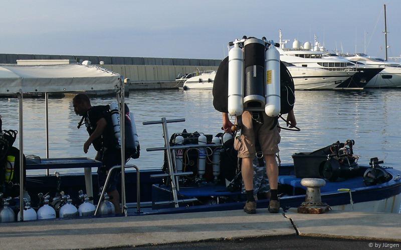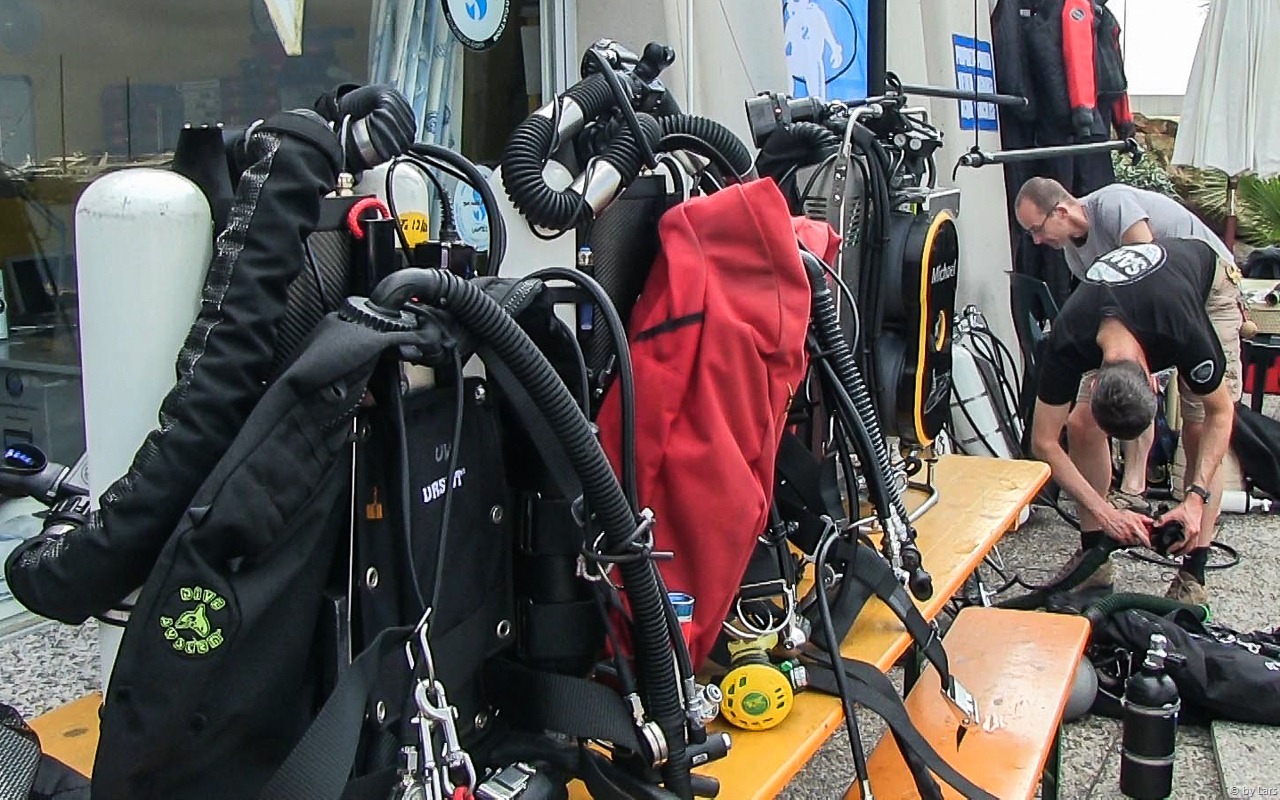 In der Basis “Nautilus Technical Diving Center” eingetroffen, werden erst einmal die Formalitäten erledigt. Danach beginnen wir mit unseren Tauchvorbereitungen, denn es soll heute noch das Wrack des Flugzeugbombers Fiat BR20 betaucht werden. Ich muss wohl nicht erwähnen, wer als erstes sein Tauchgerät aufs Boot brachte! ![]()