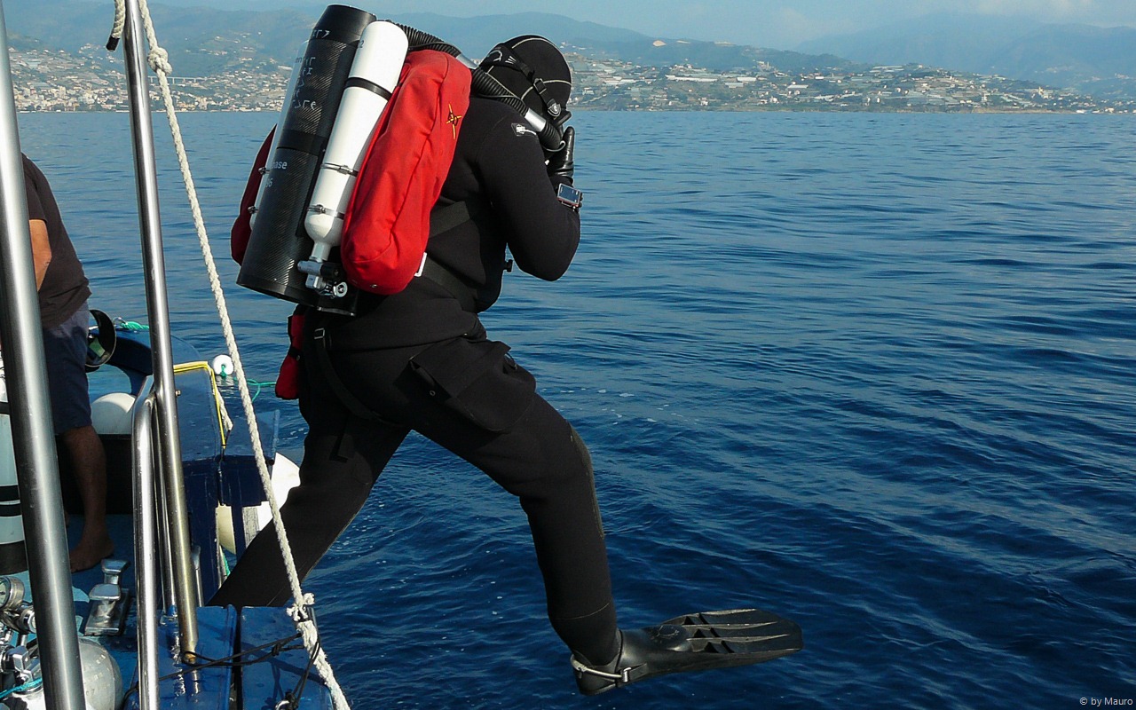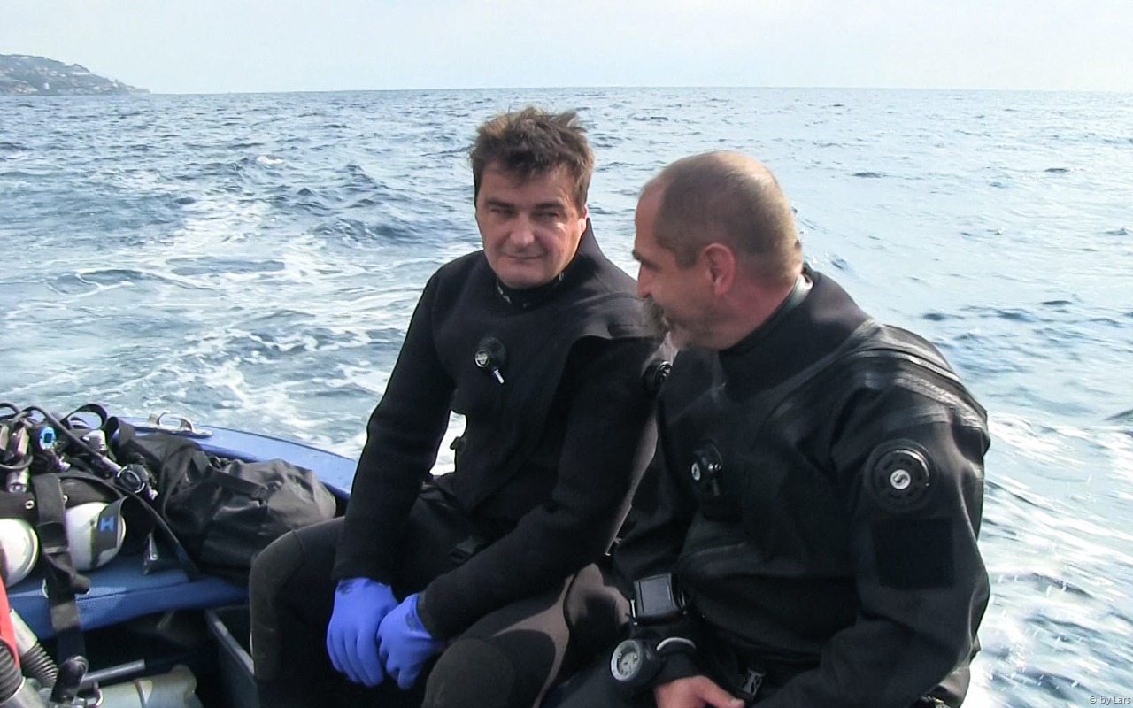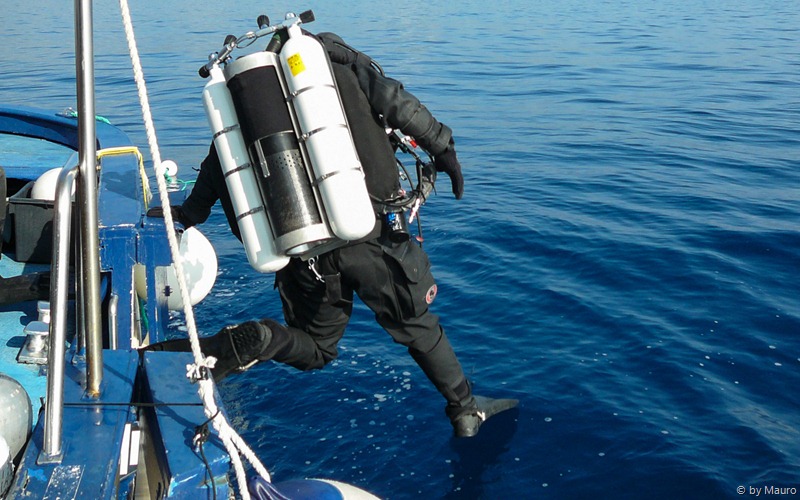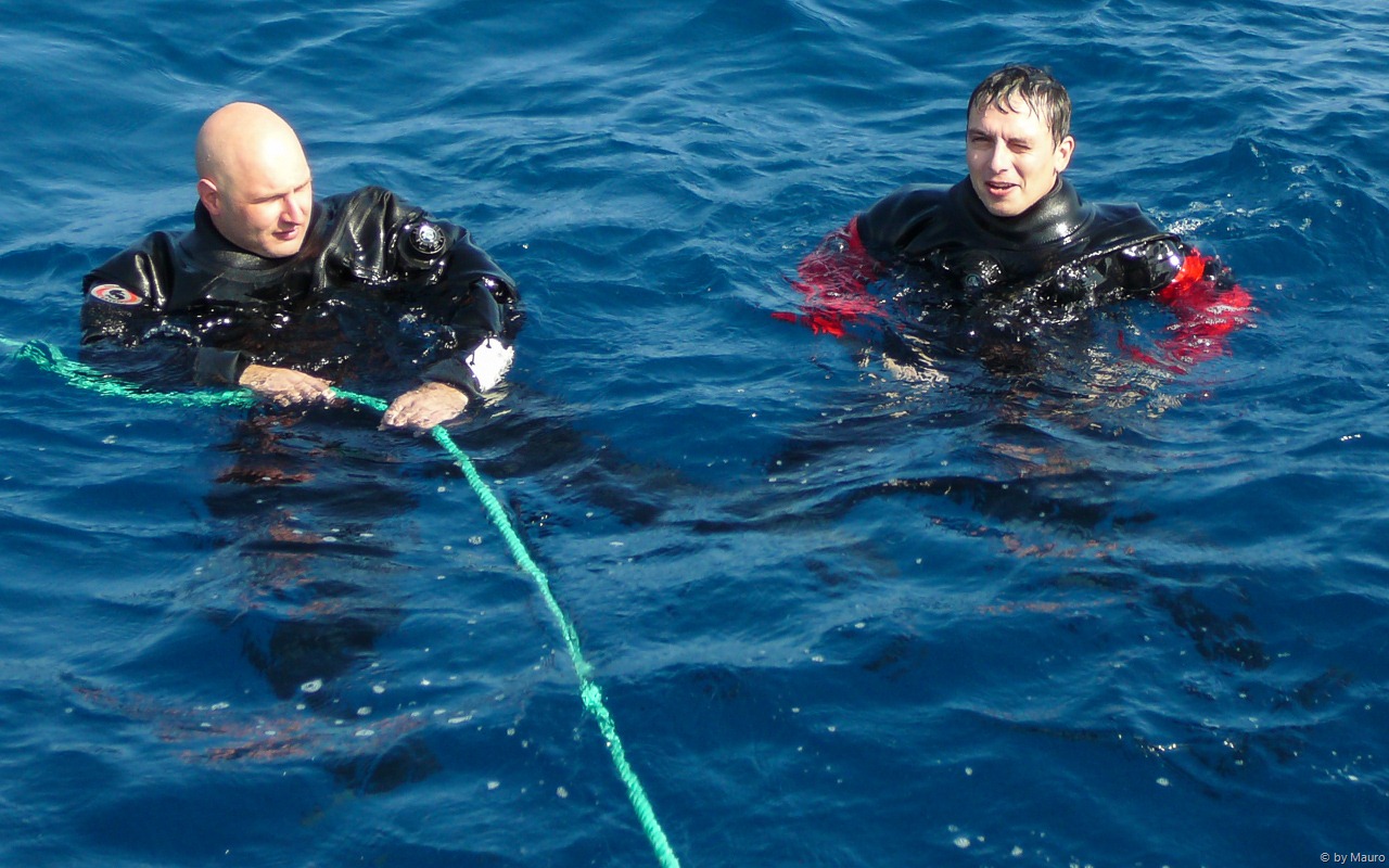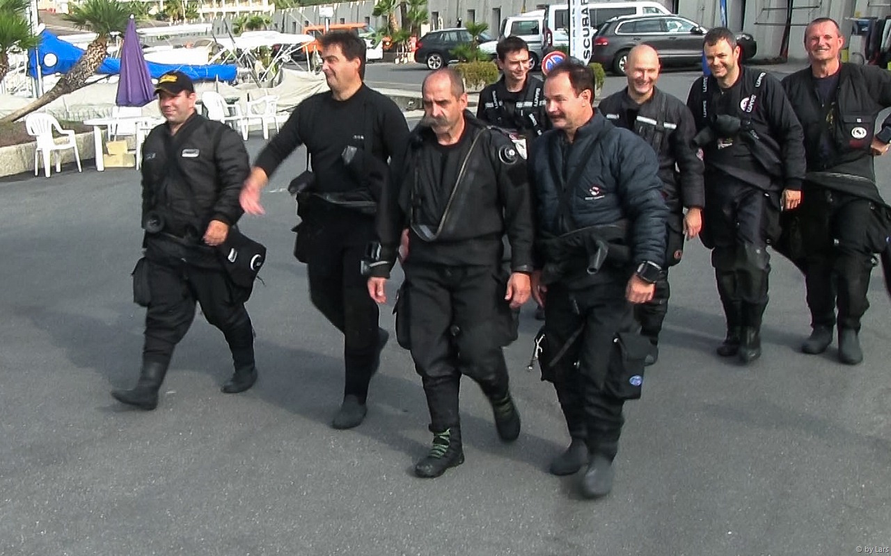 Der Tauchgang eignet sich mit seiner Maximaltiefe von 47m ideal zum Eintauchen im Ligurischen Meer. Beim Abtauchen halten wir die gesamte Woche die gleiche Reihenfolge ein: zuerst die CCR gefolgt von den PSCR, die OC Taucher mit den kürzeren Runtimes zum Schluss.